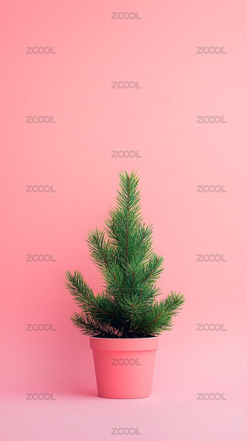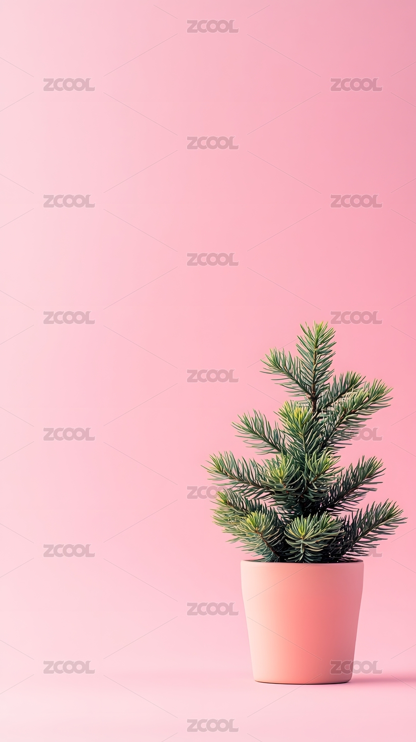 粉色背景下的盆栽松树