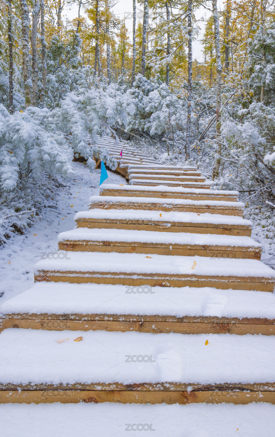 中国大兴安岭林中铺满雪的木台阶