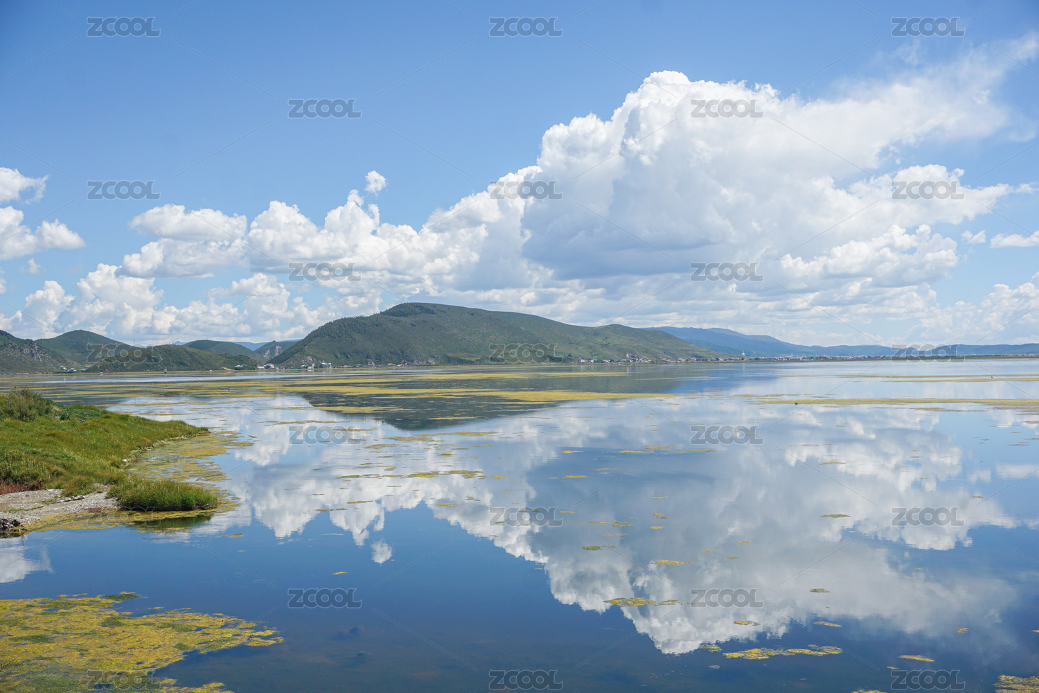 中国云南香格里拉蓝天白云绝美普达措湿地