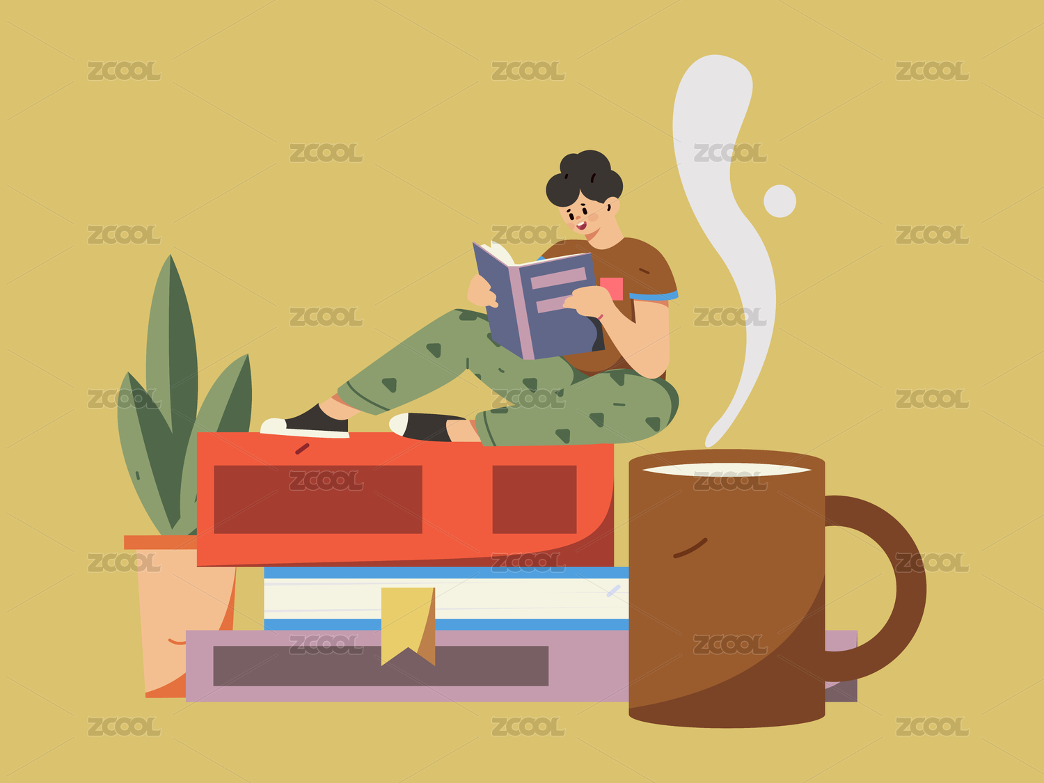 男性坐着靠着一堆书手里拿着书在挑灯阅读