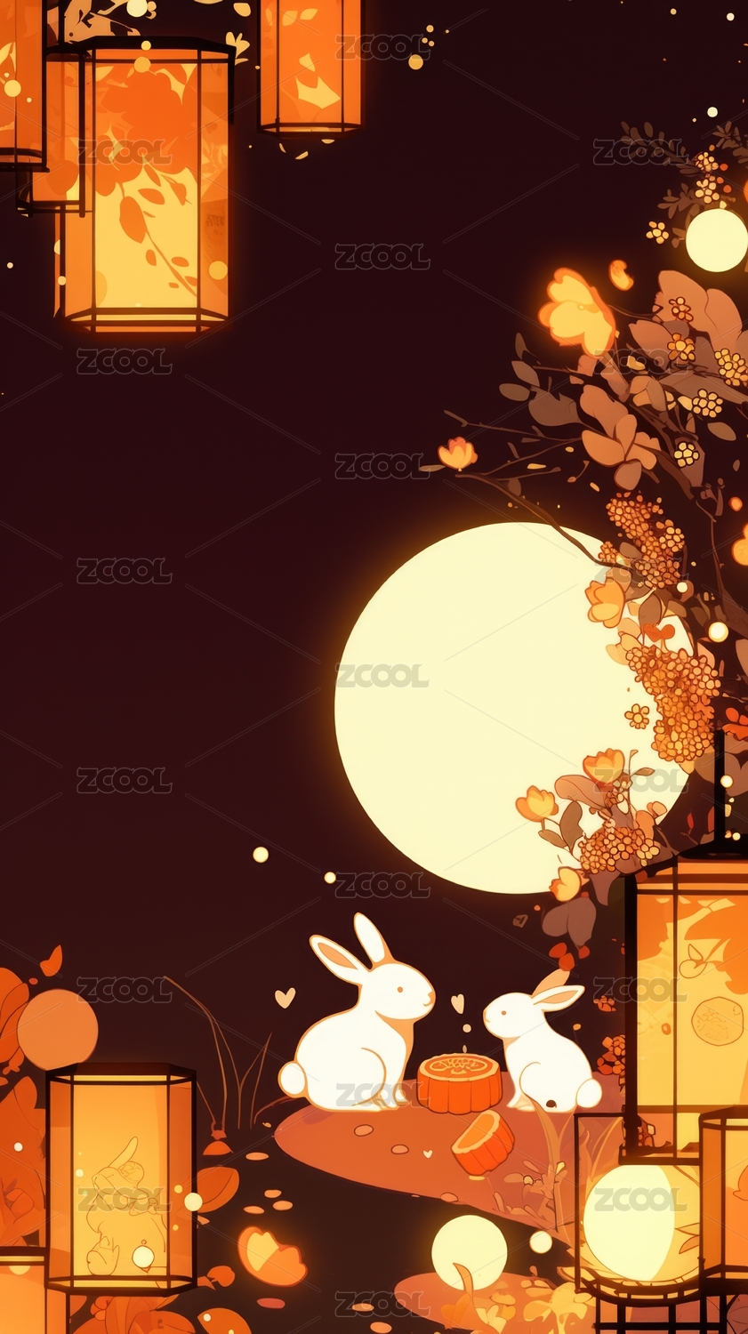 月光下的兔子与灯笼