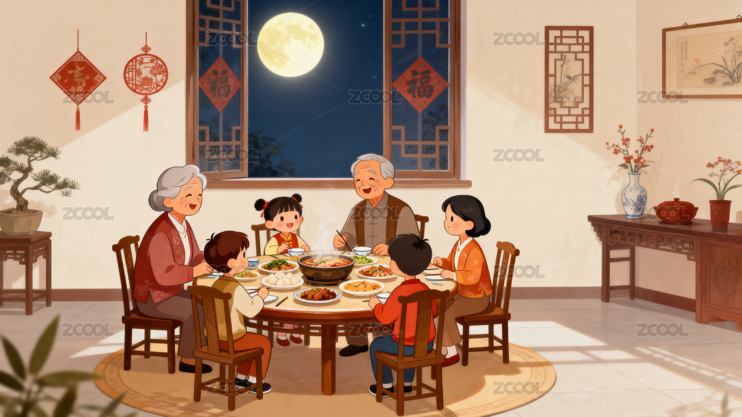 中秋节一家人团圆聚餐吃饭传统节日聚会插画