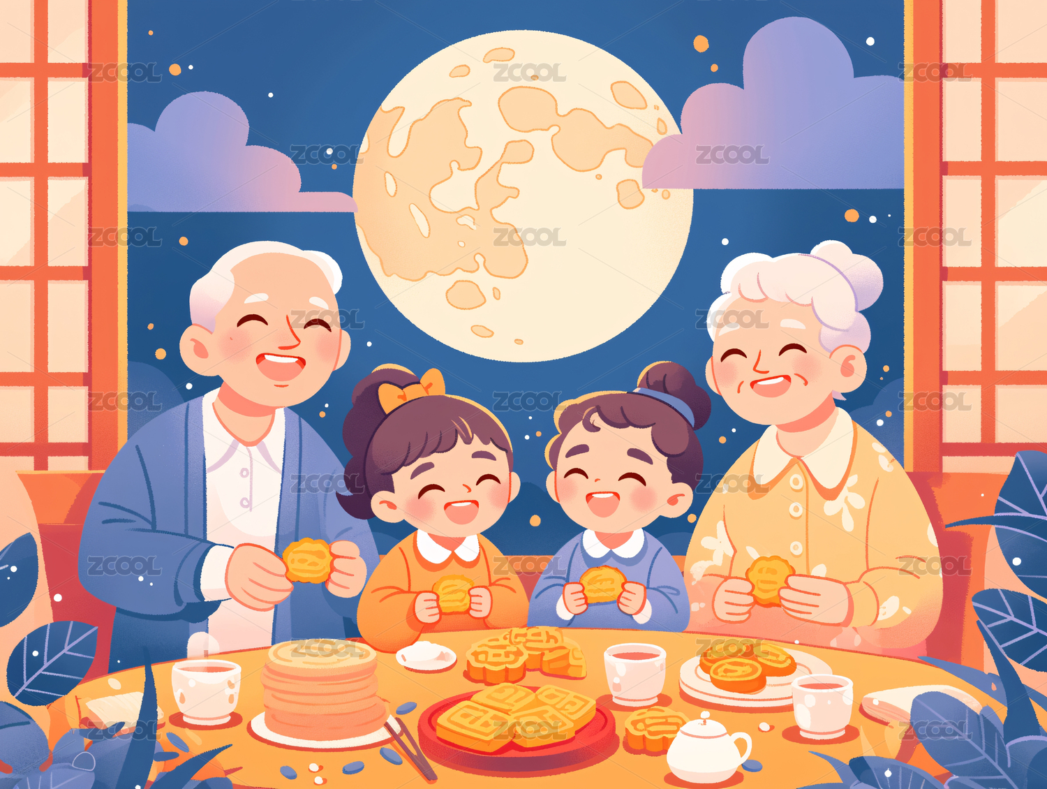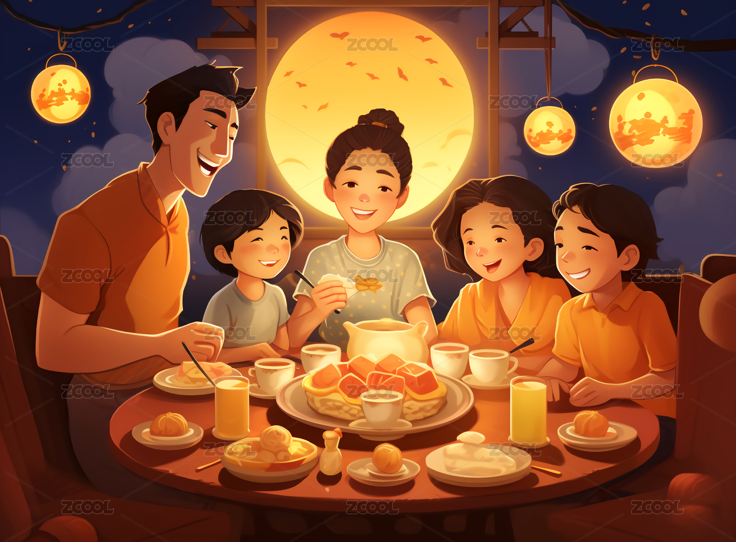 中秋节,AIGC202403,中秋,月亮,家庭,人,月饼,团圆,美食,卡通