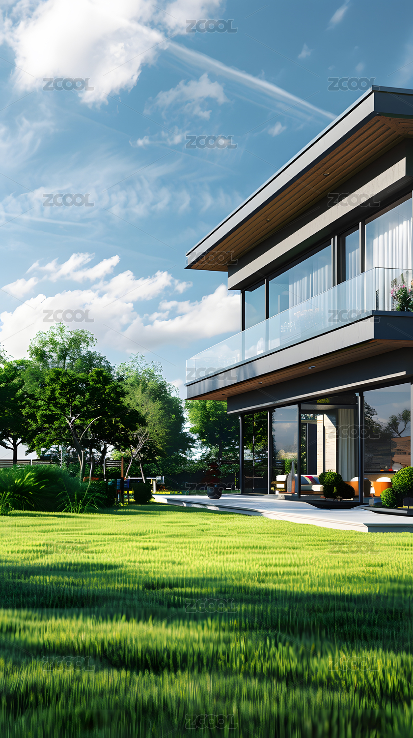 3D渲染现代中式别墅与草地