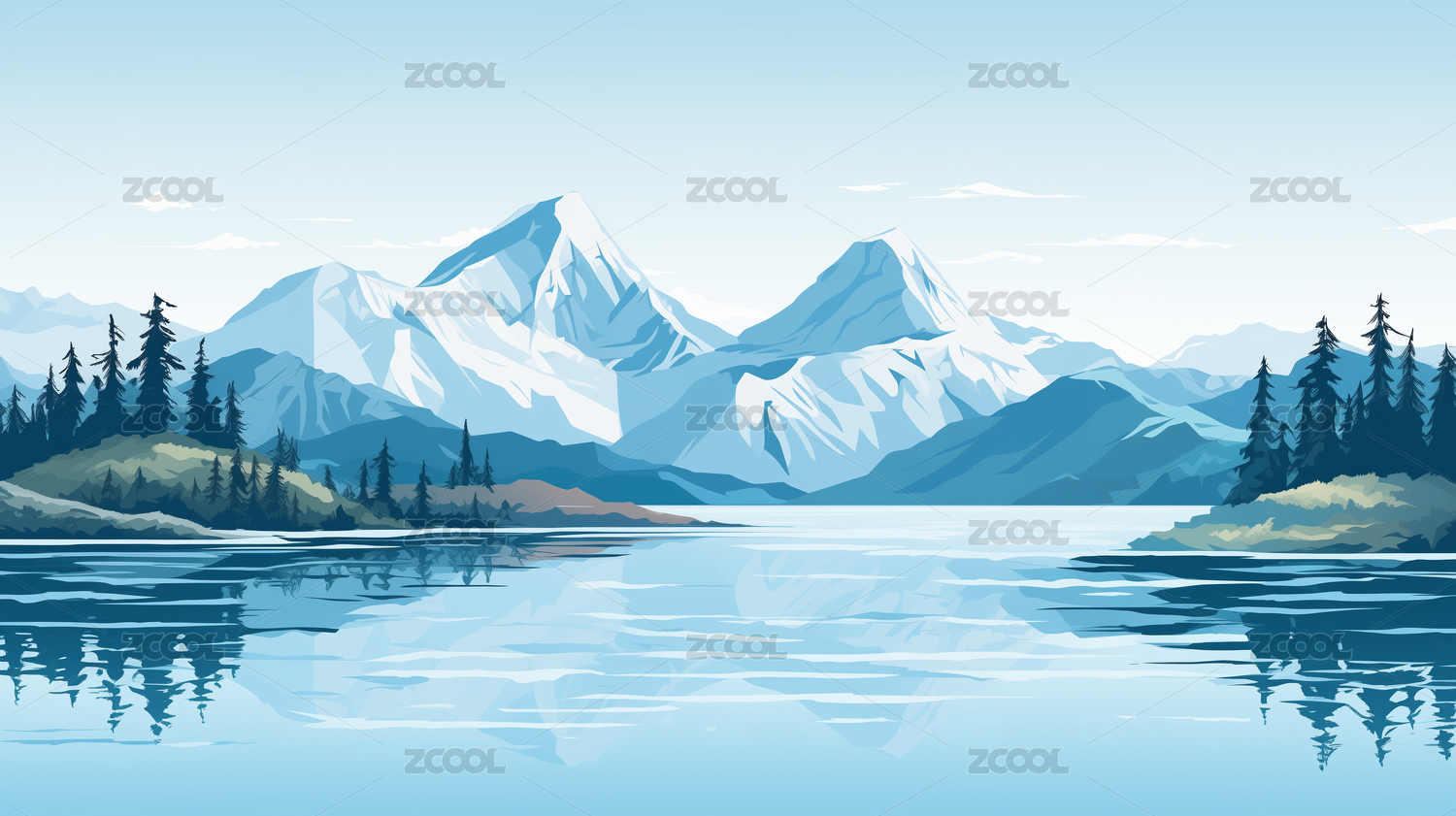 风景插画雪山湖泊山水画