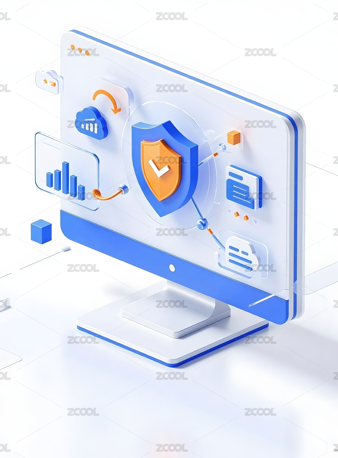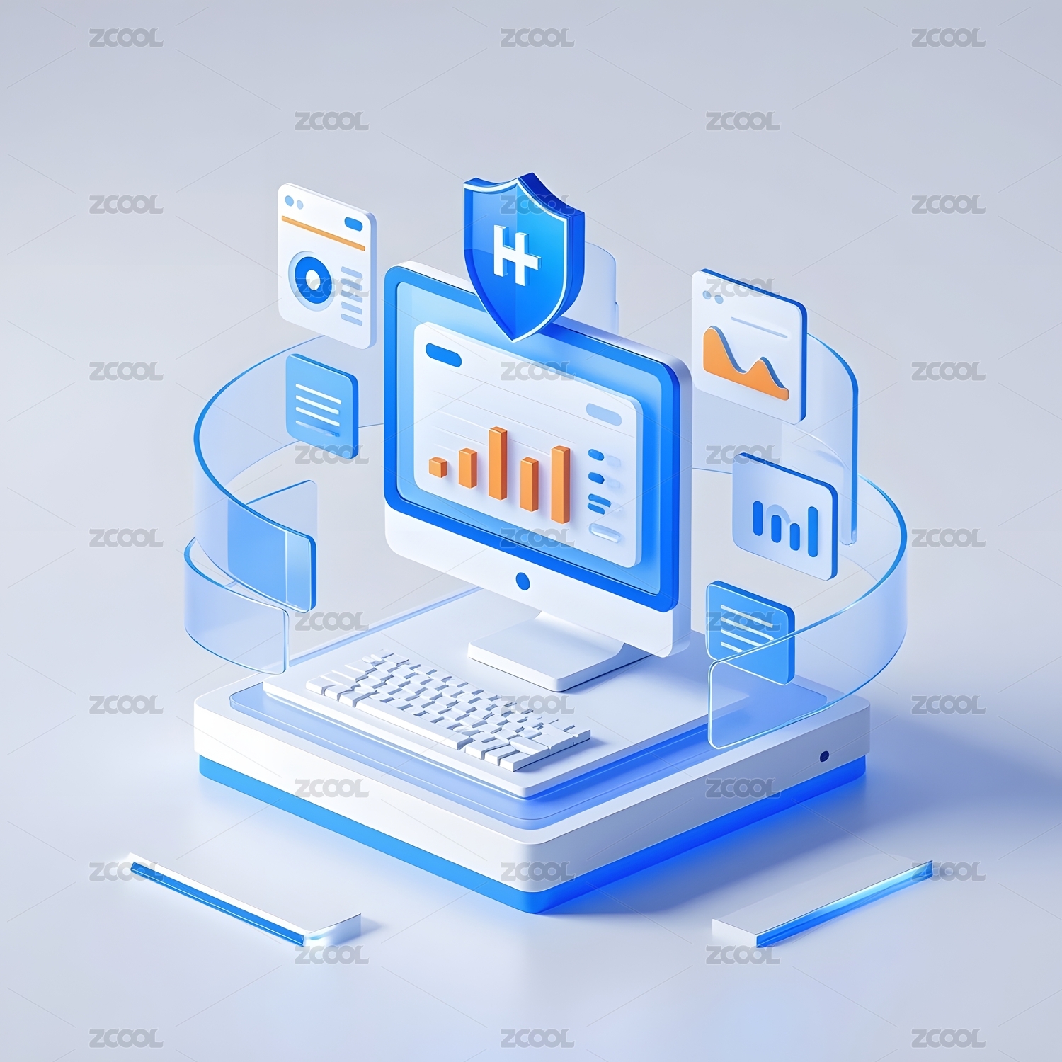 电脑周围有放大镜齿轮护盾云等矢量插画