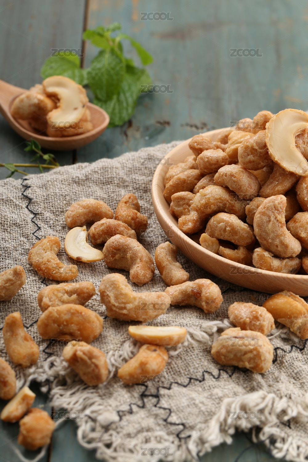木底上放着一碗带皮腰果和去皮的腰果仁