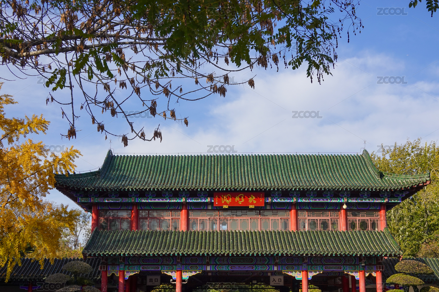 中国济南树叶前景下的长廊屋顶与拱桥