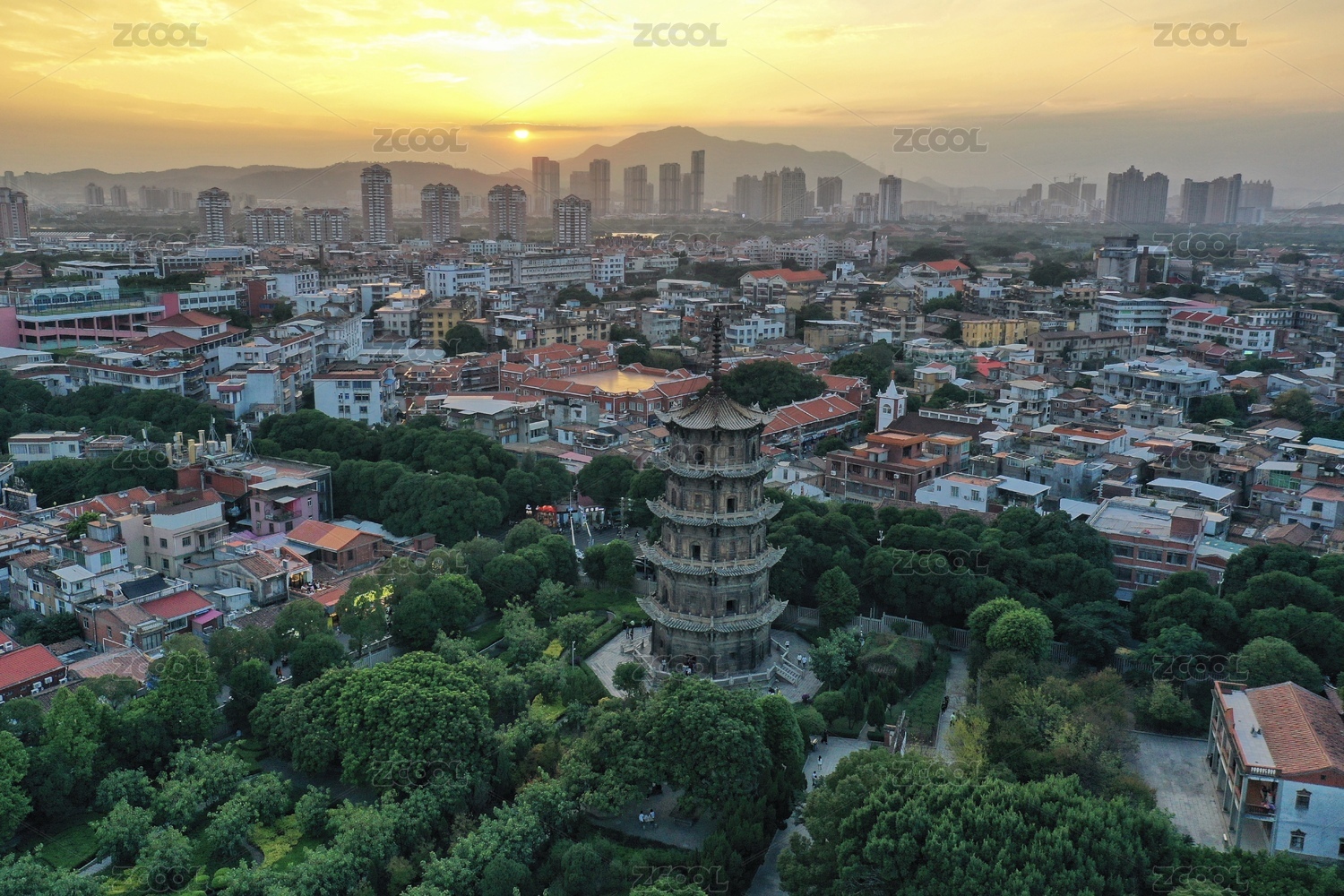 航拍日出时分福建泉州古城开元寺双塔特写