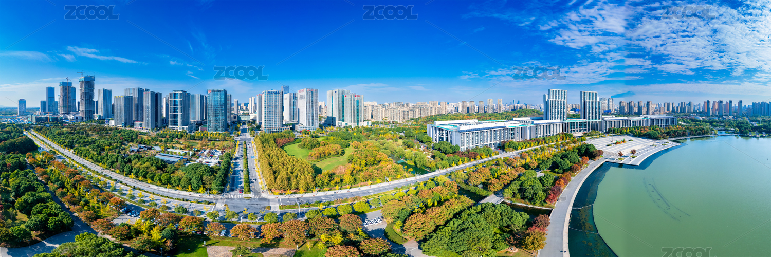 航拍中国河南郑州龙子湖公园湖泊湿地全景图