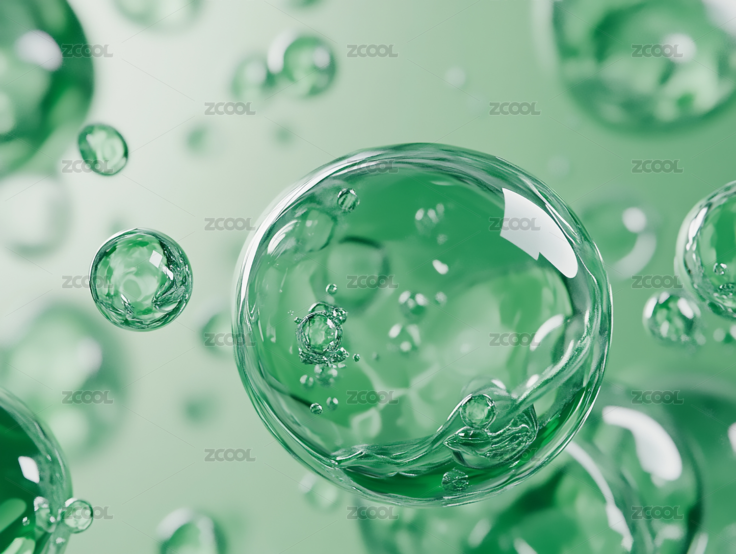 光滑水面绿色背景中的泡泡化妆品成分插图