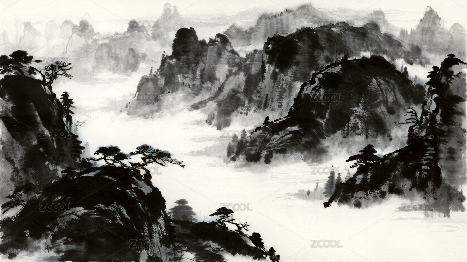 黑白中国风水墨风山水画,手绘国风意境水墨