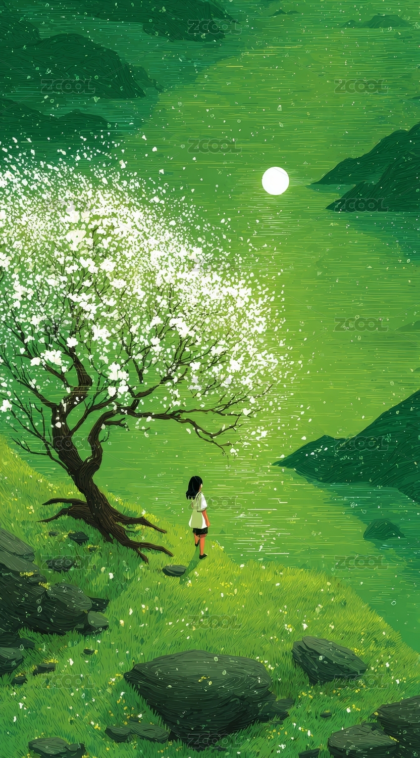 手绘,插画,创意,治愈,风景,自然,春季,夏日,大树,云海