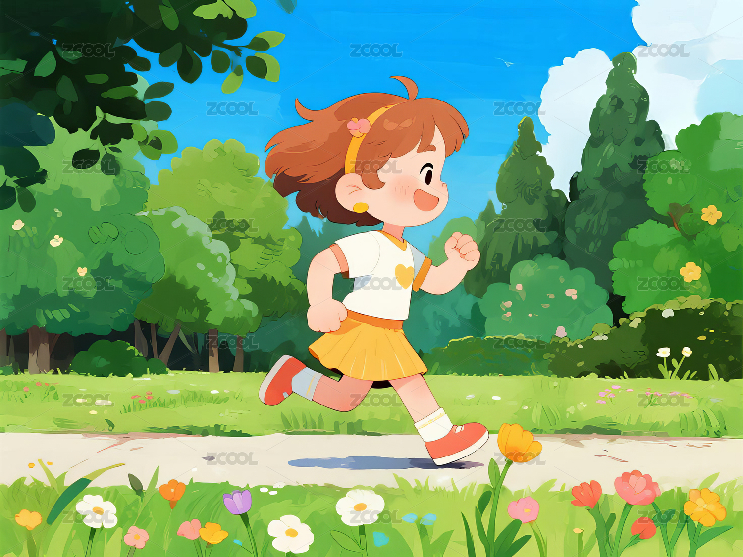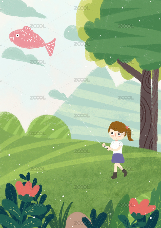 儿童,儿童节,放风筝,插画,绿色,夏天,小女孩