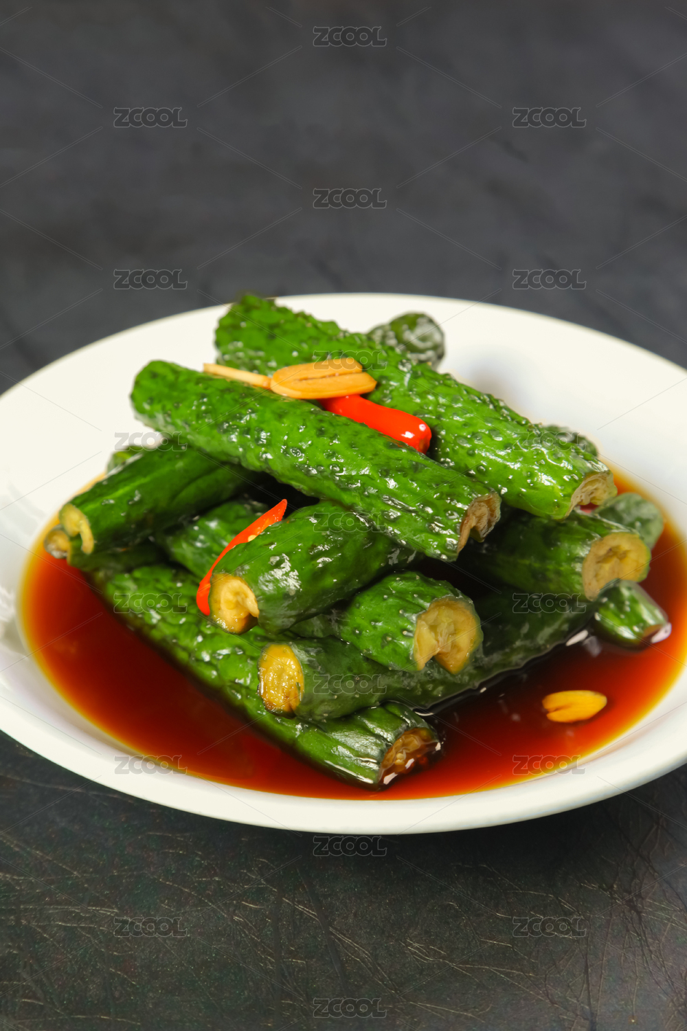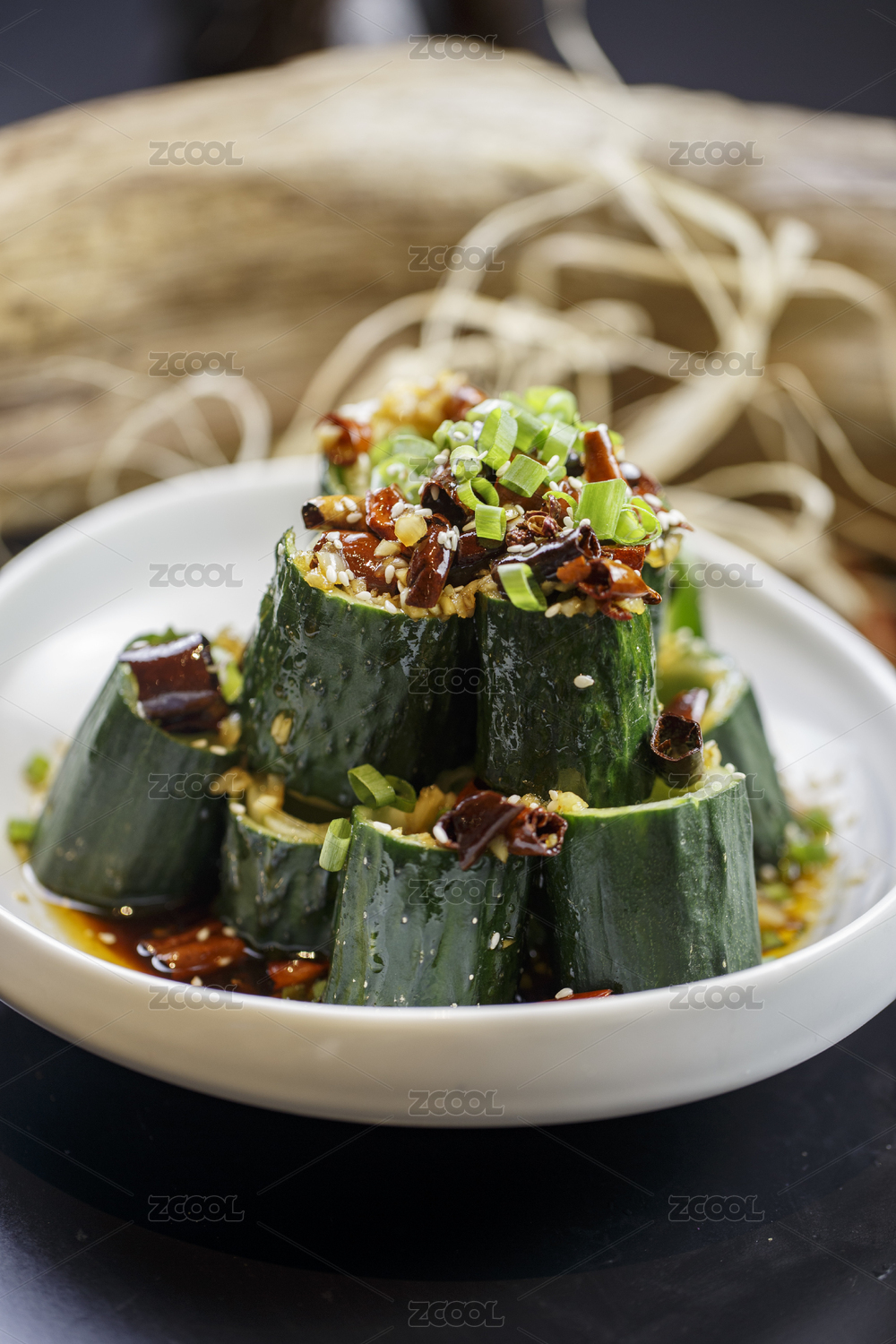 圆形白瓷盘装的风味青瓜段(黄瓜)