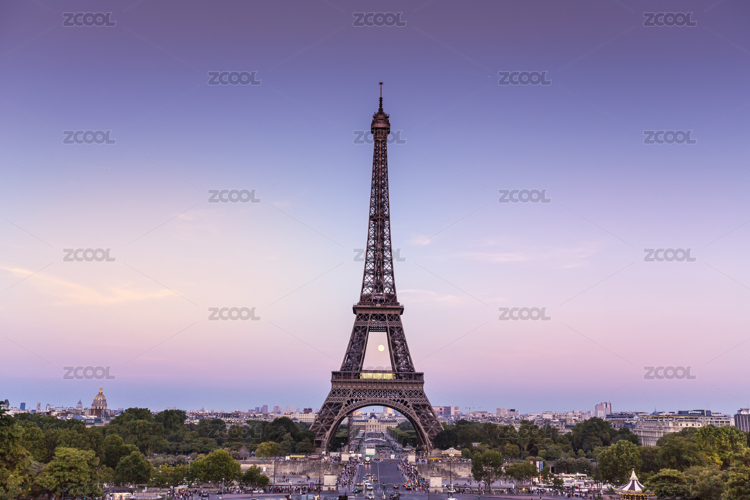 黄昏时分月亮升起在巴黎埃菲尔铁塔身后