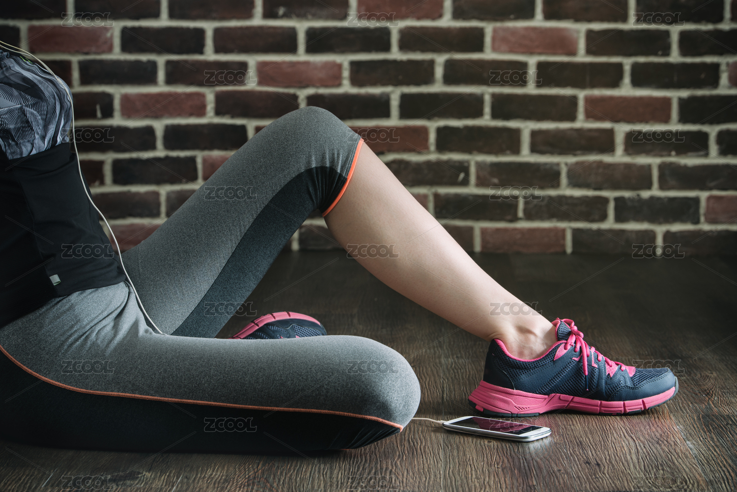 喜欢听音乐后的健身运动训练,坐在木地板,健康的生活方式