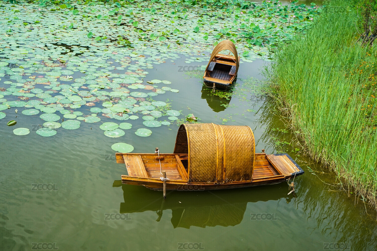 芦苇,湖面,水面,木船,渔船,水乡,江南,绿色,黑色,倒影