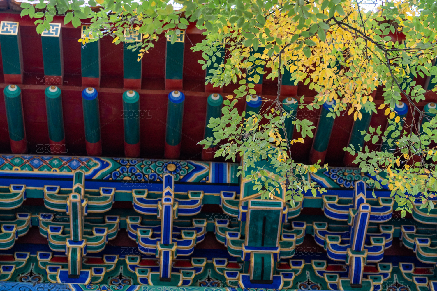 北京故宫博物院红墙绿瓦和前景的绿色树叶