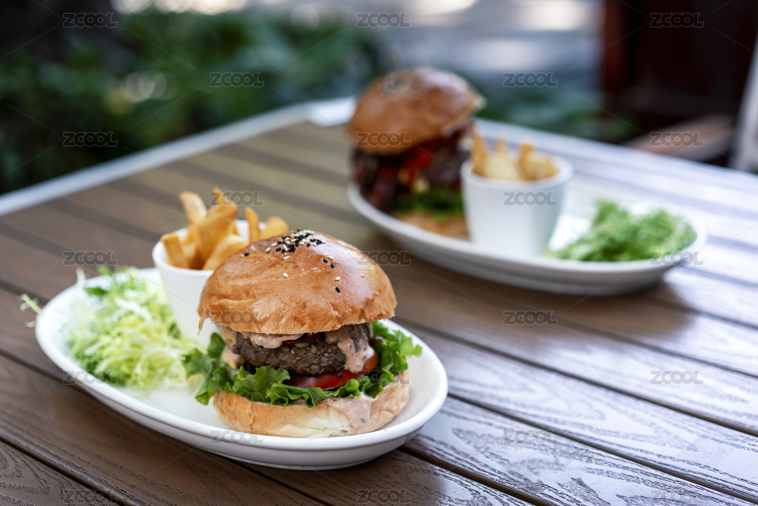 户外餐桌上的牛肉汉堡套餐