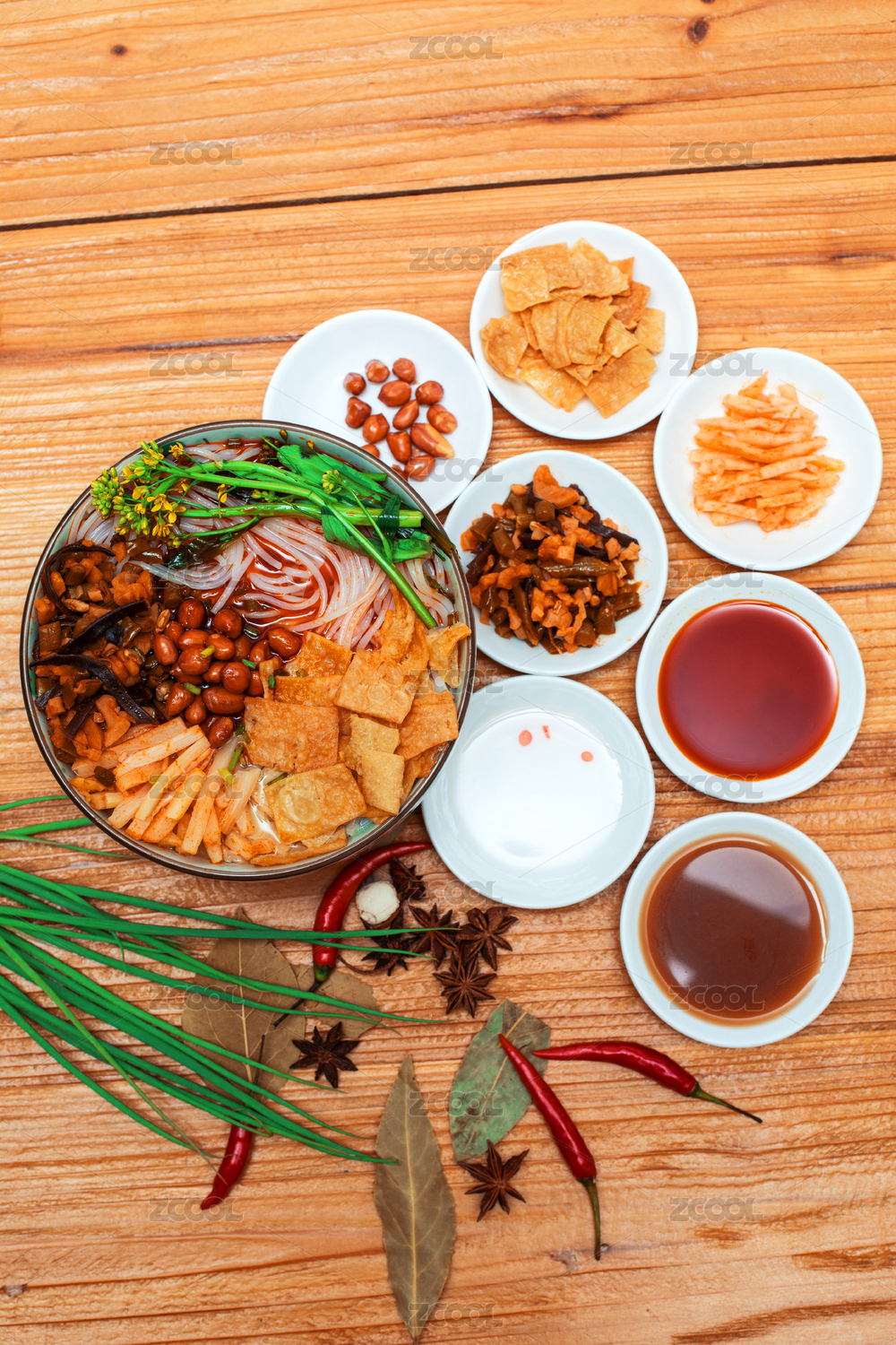 放在木桌上的一碗广西柳州美食螺蛳粉