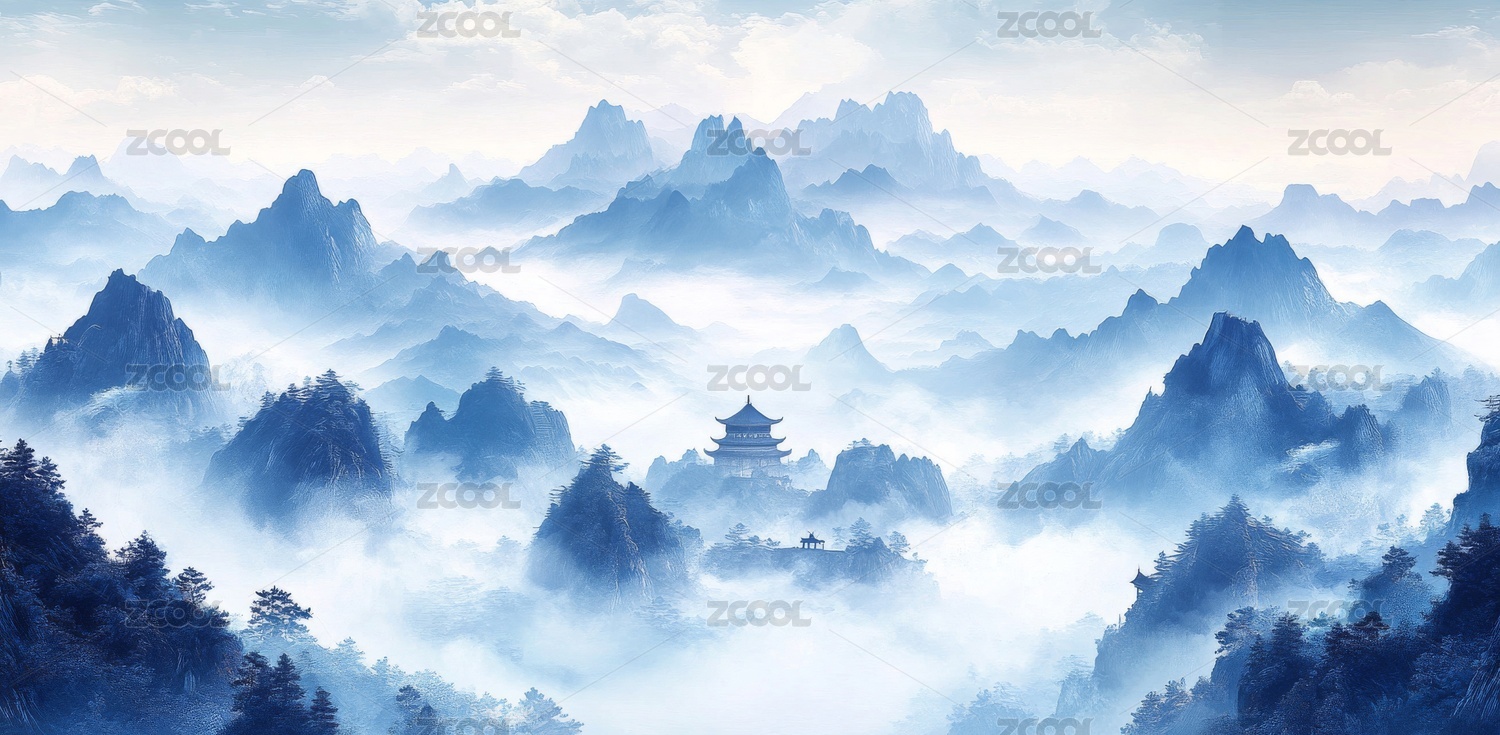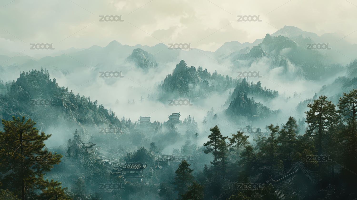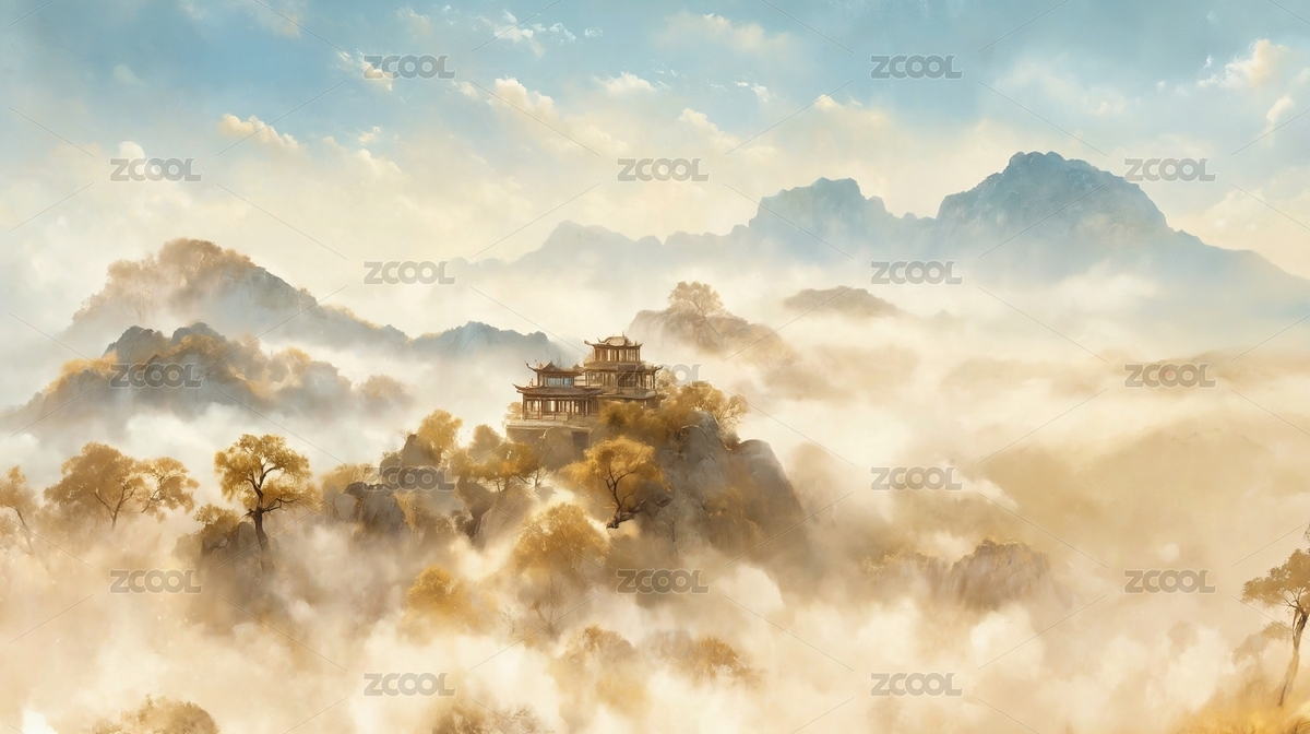 云海,山峰,山居,树木,房屋,雾气,天空,云朵,山林,自然