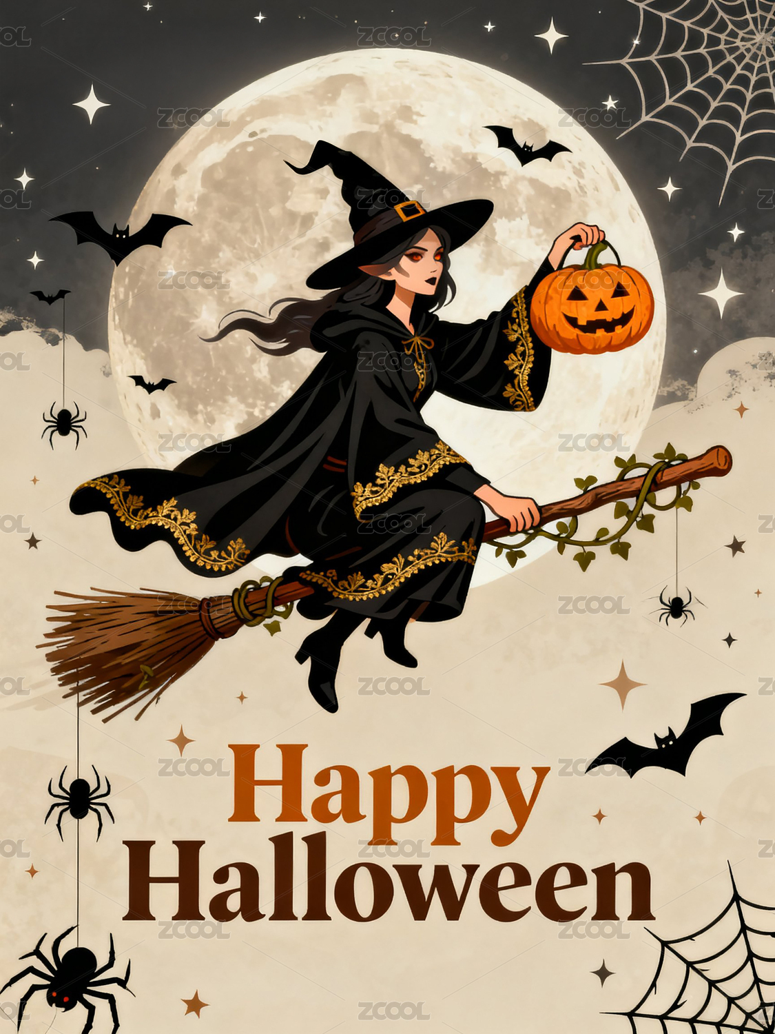 万圣节南瓜扫帚猫咪魔法小魔女海报