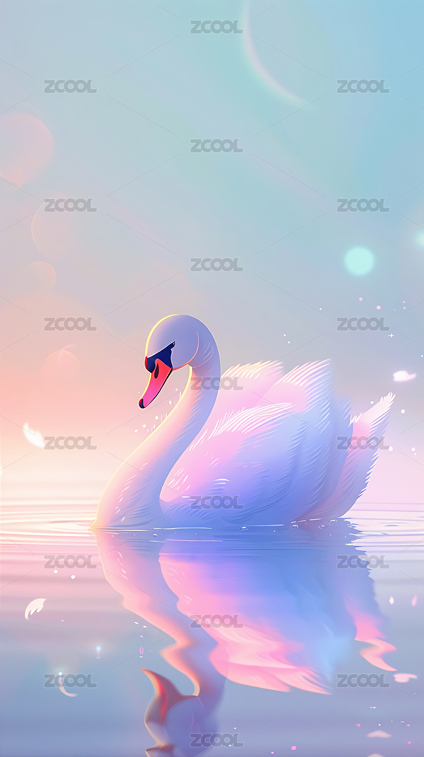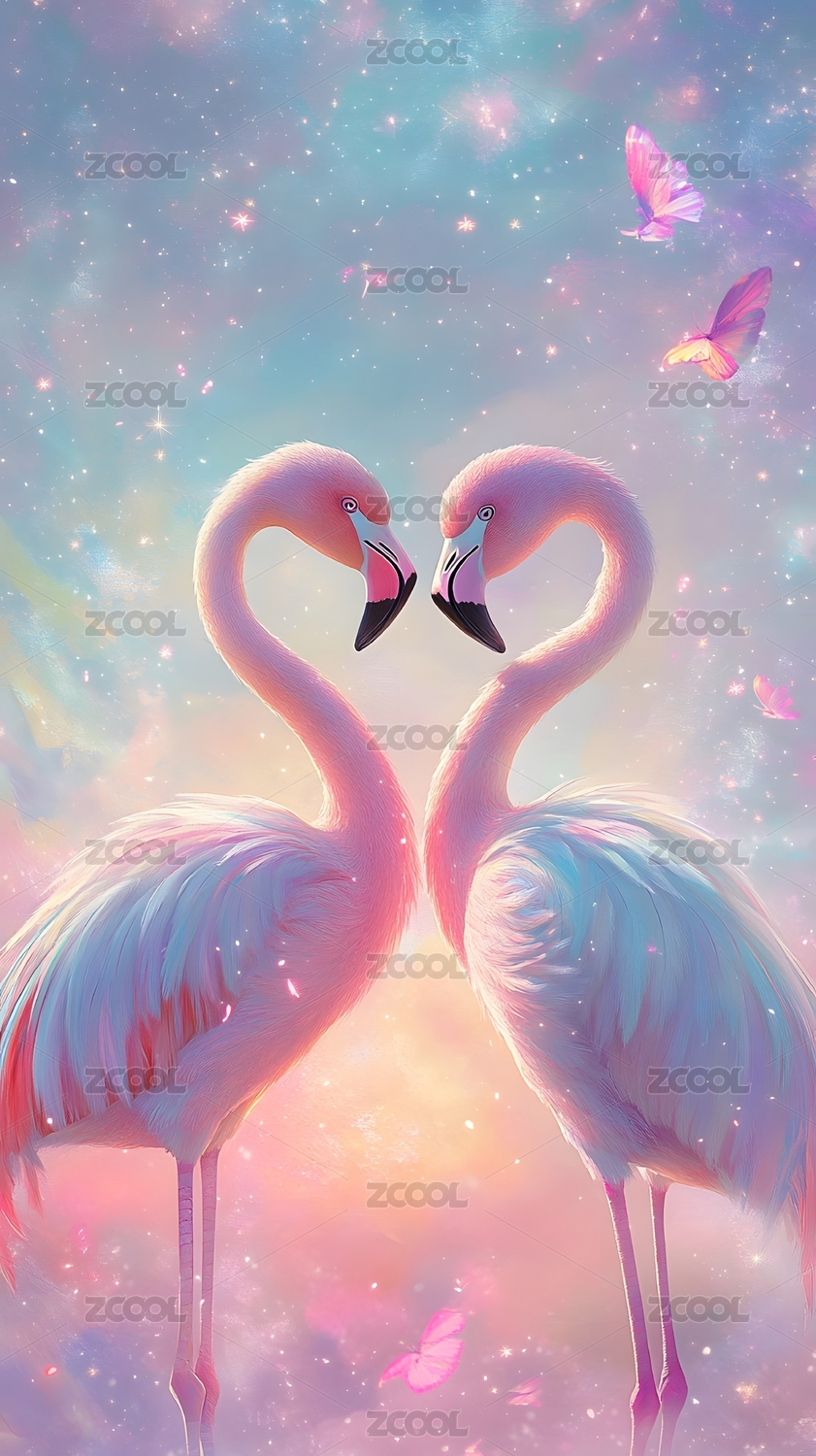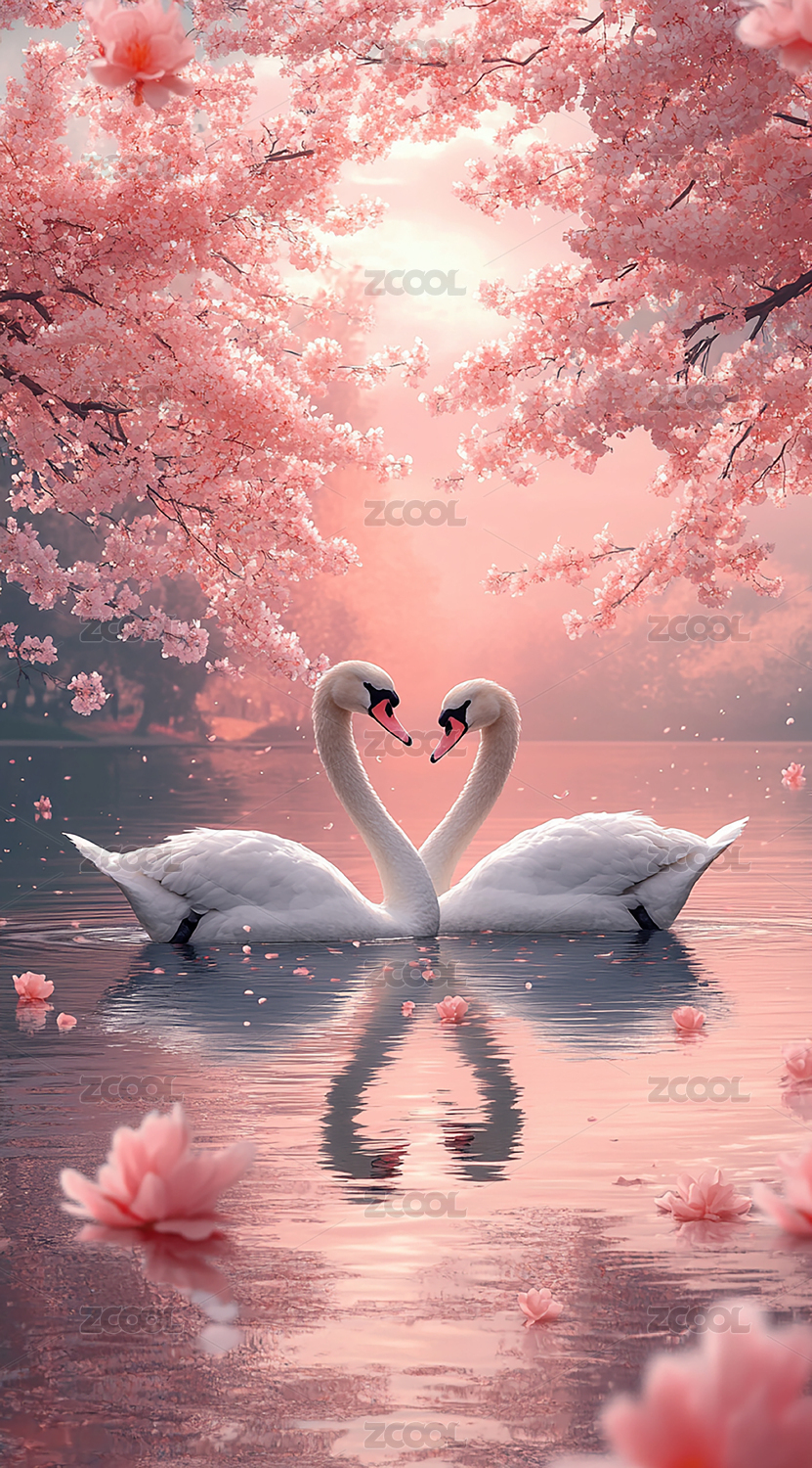 心形交颈天鹅相依相偎,粉色浪漫星空唯美