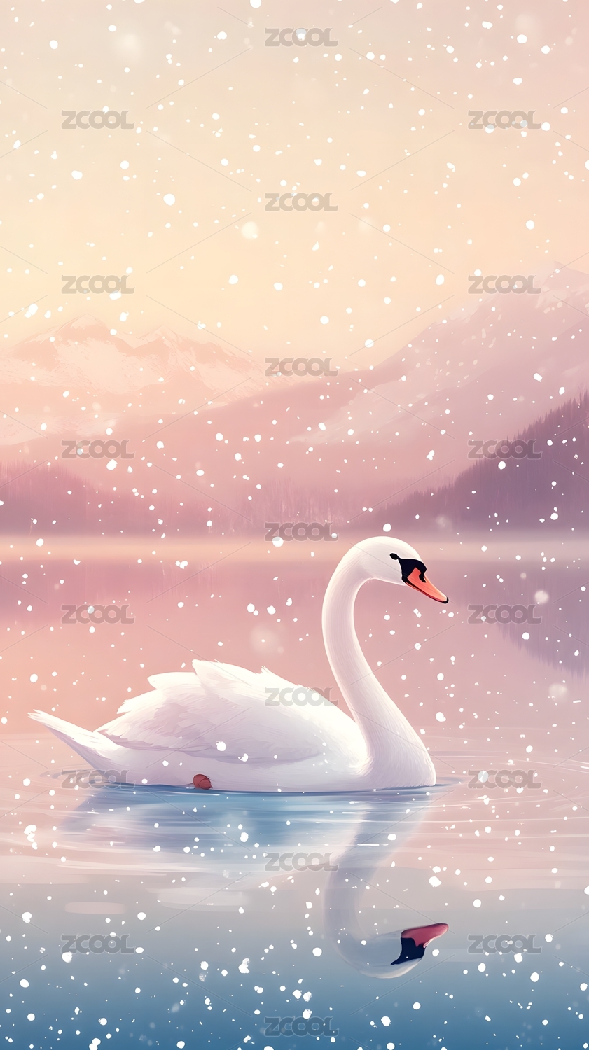 雪花,浪漫,唯美,粉色,梦幻,天鹅,冬季,湖面,优雅,水波纹