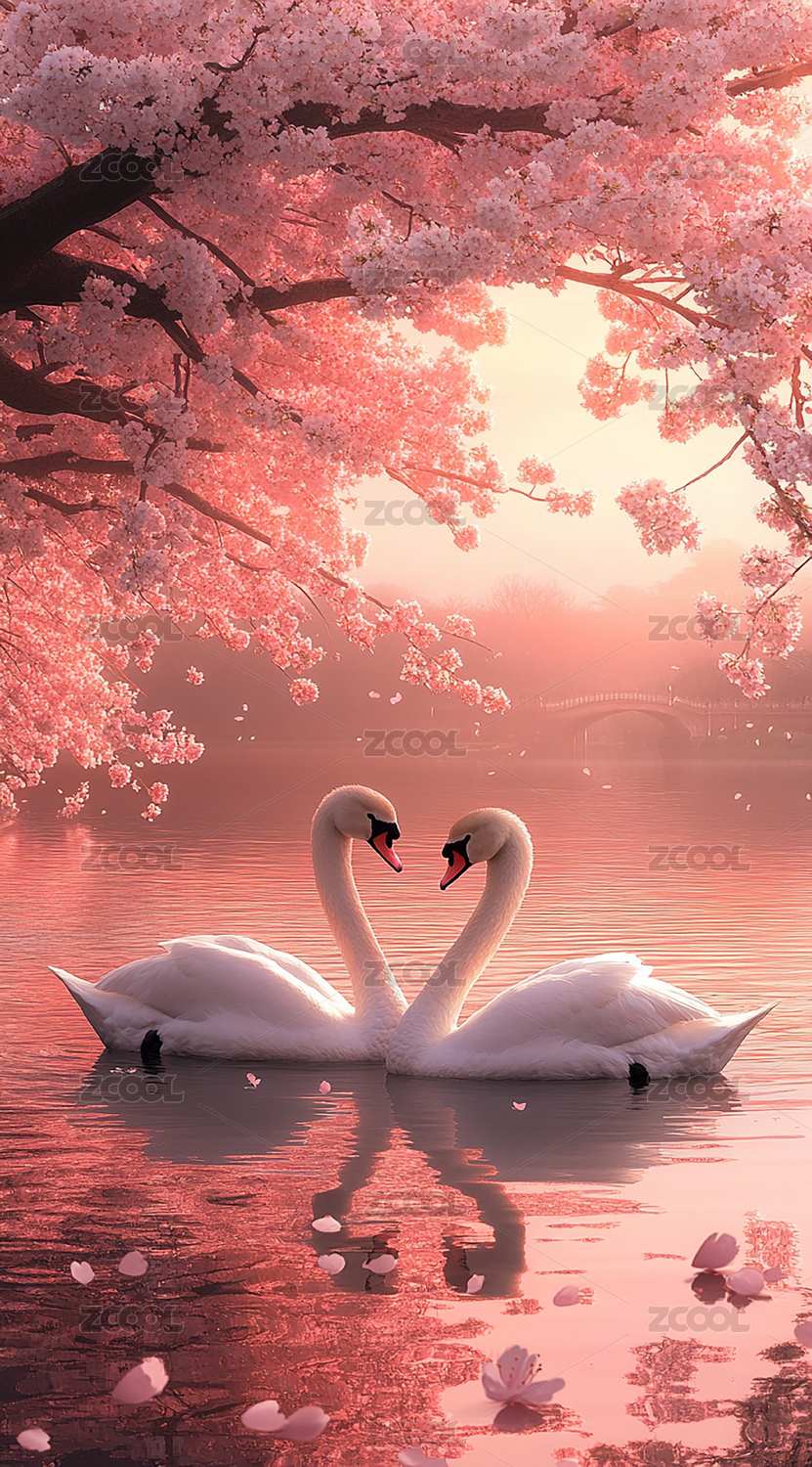 春日浪漫唯美,樱花盛开,天鹅湖畔相依相偎