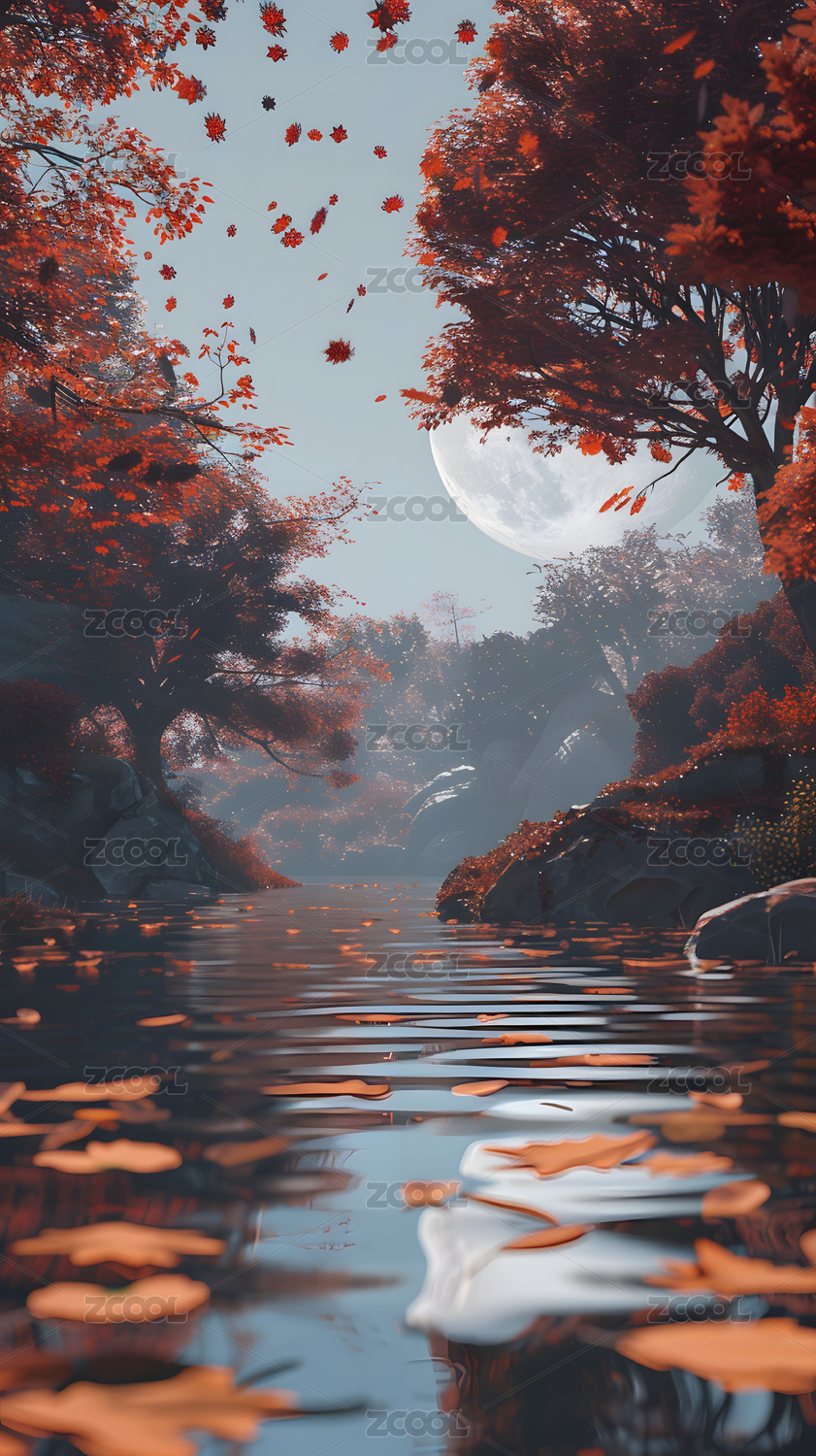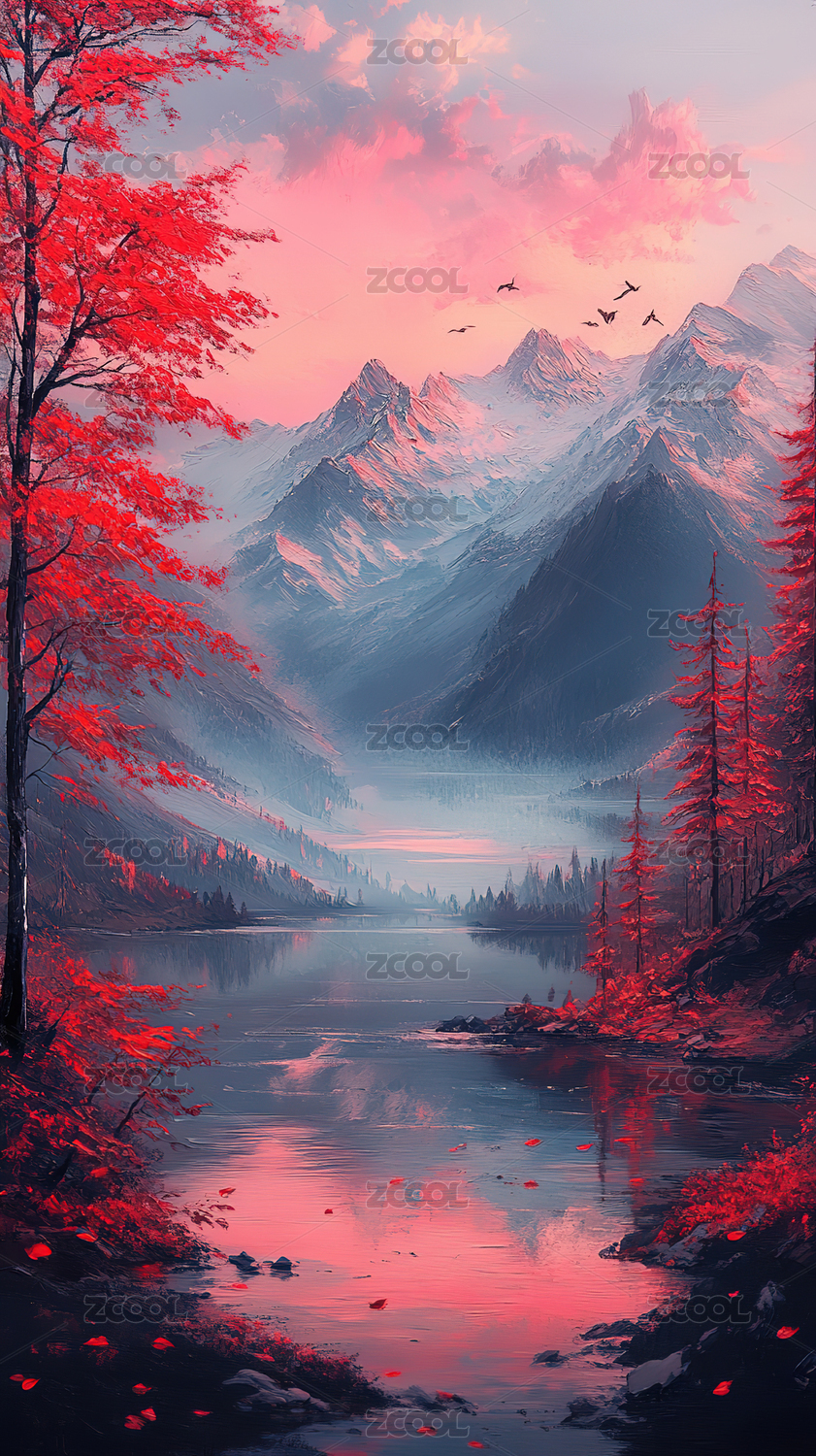 梦幻, 浪漫, 艺术, 插画, 湖泊, 水面, 唯美,红叶, 天鹅, 秋天