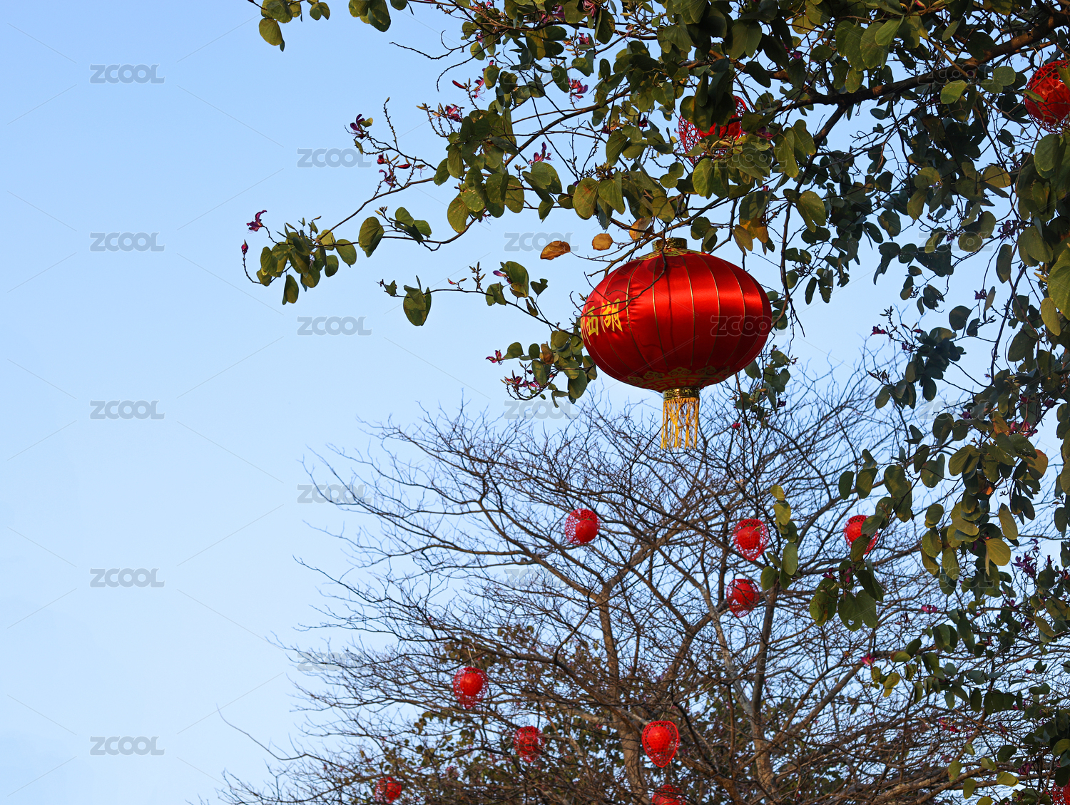 景山,红灯笼,传统,喜庆,蓝天,天空,树枝,槐树,龙抓槐,流苏