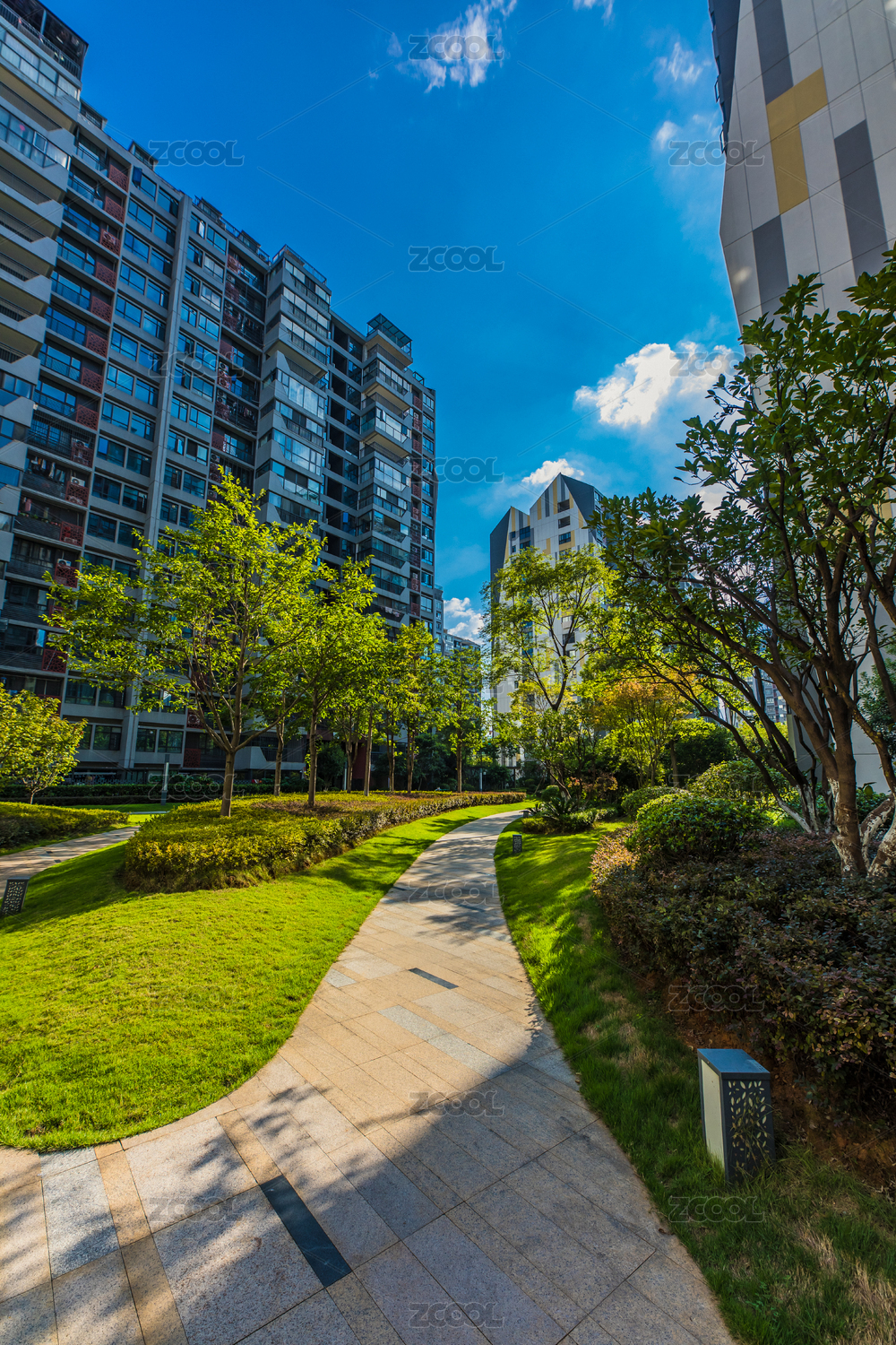 小区住宅里弯曲的步行道,砖路边绿色草坪,园林景观设计
