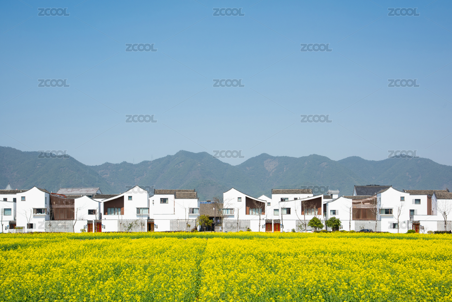 浙江杭州富阳东梓关油菜花田中的现代新农村
