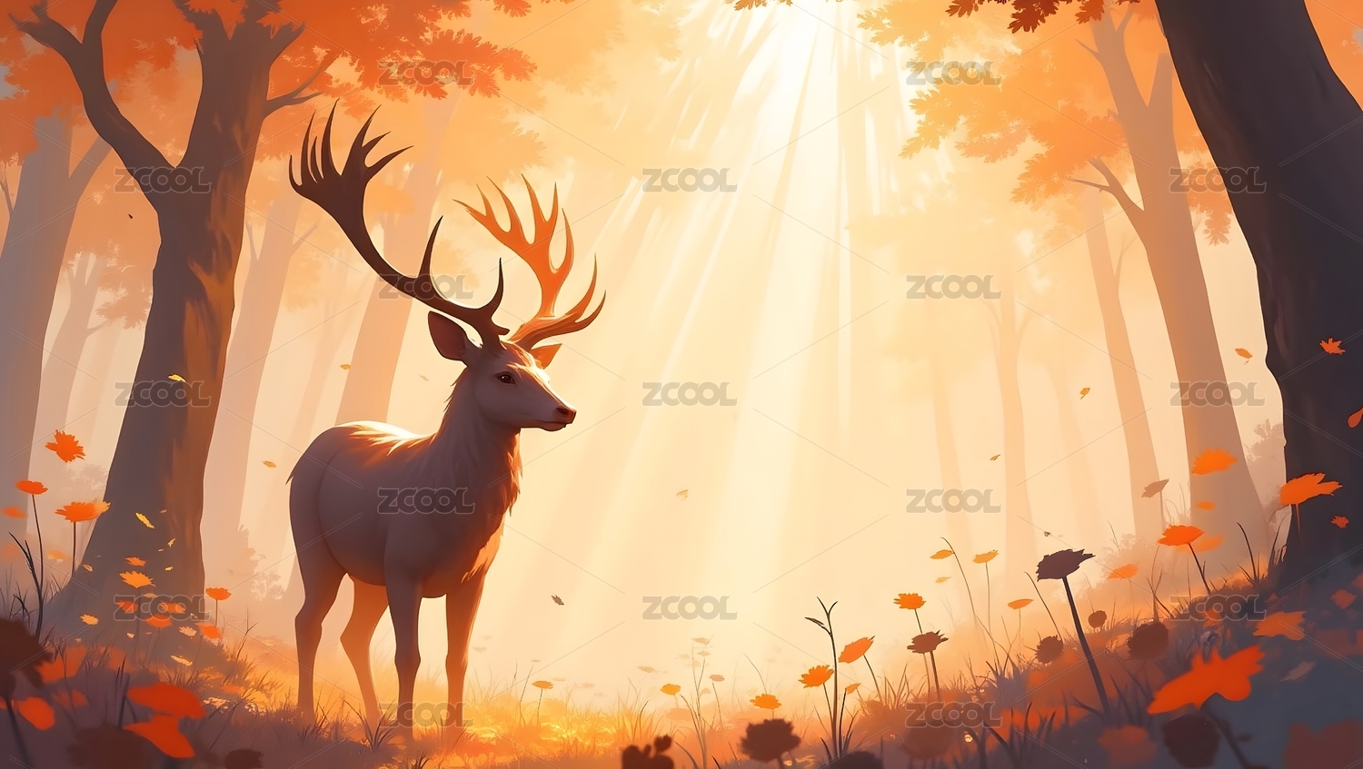 麋鹿,森林,雾气弥漫,野生动物,溪流,卡通风格,温暖,自然,生态,和谐