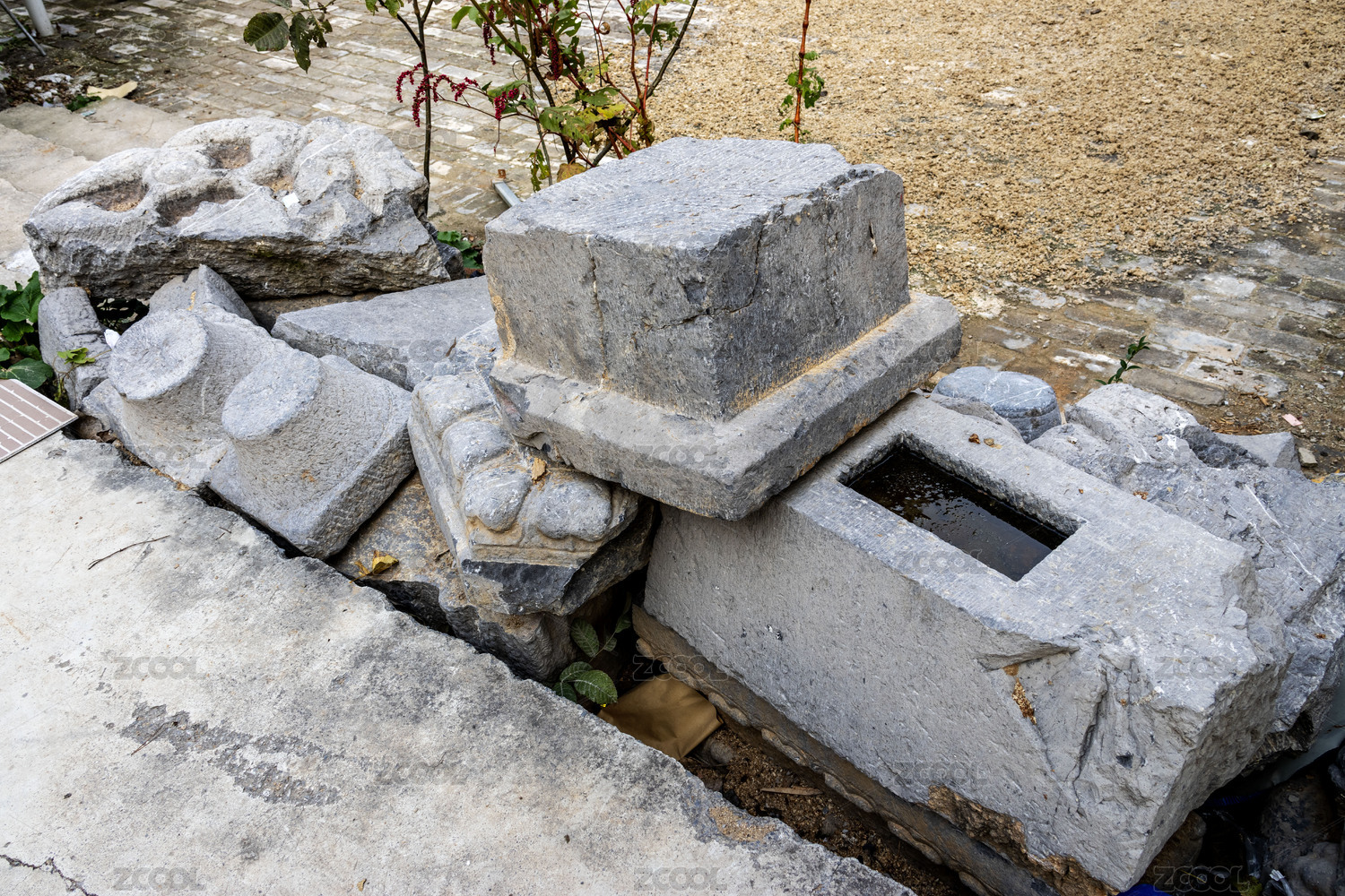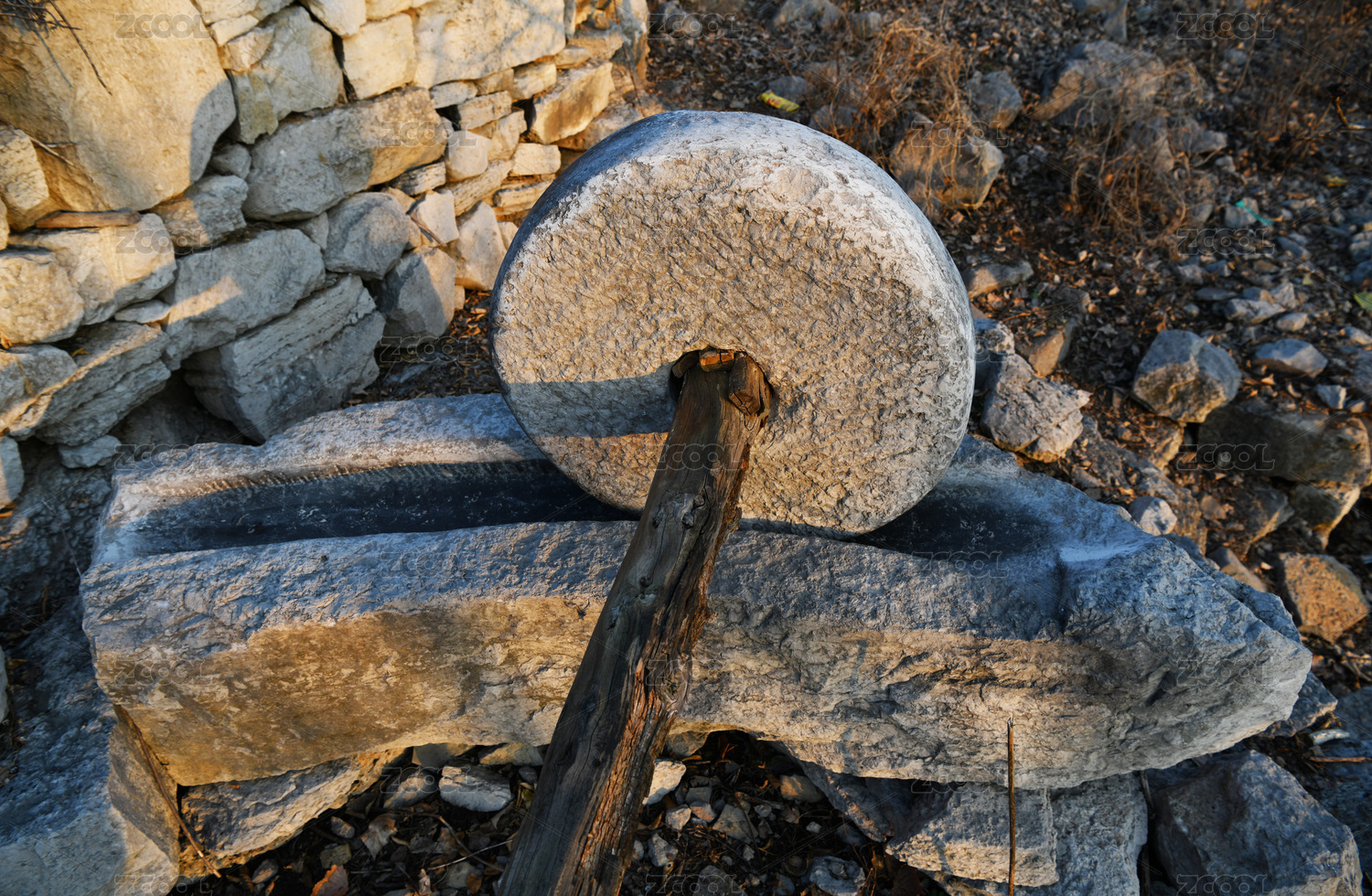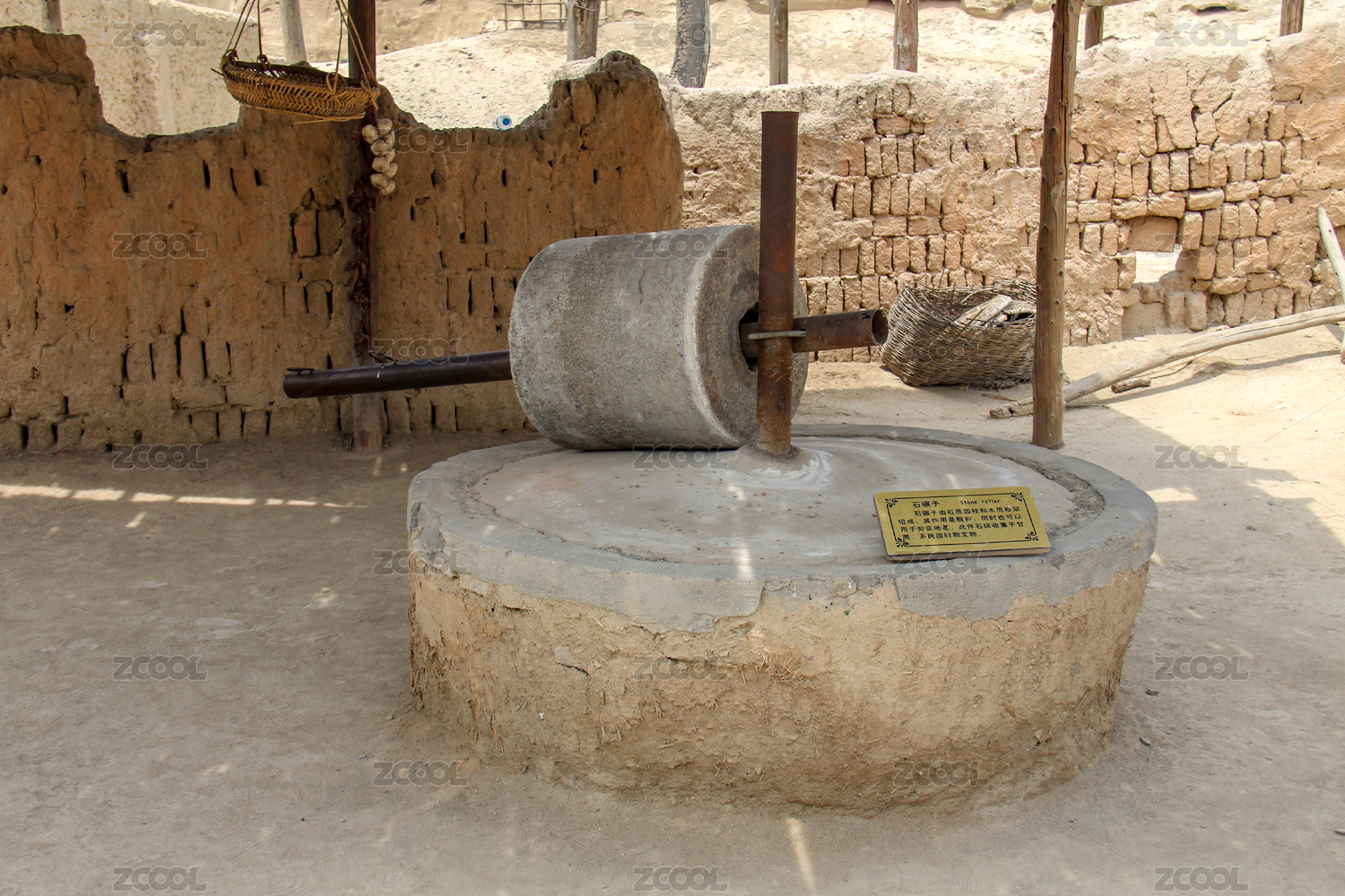 中国山东省临沂市沂蒙红色影视基地内沂蒙山村的石碾子