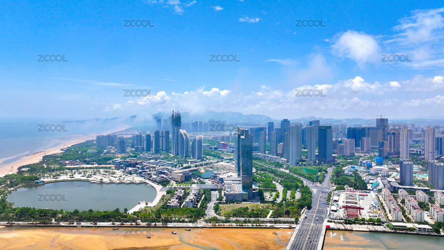 航拍中国山东日照城市建筑景观天际线