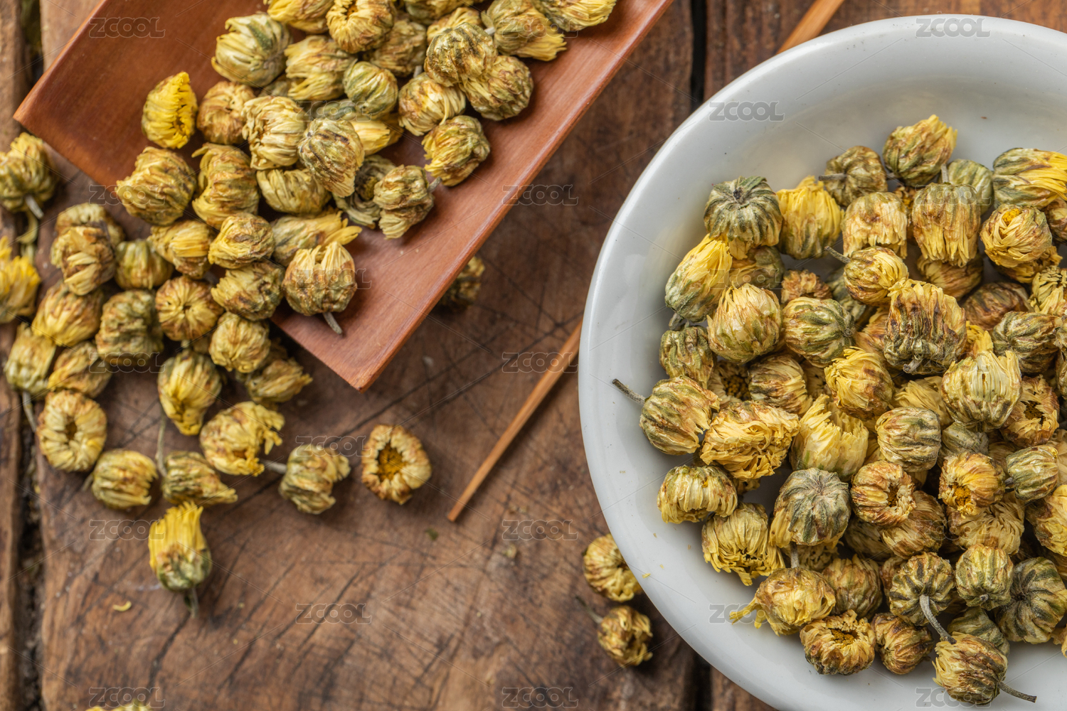 小碟子里放着许多晒干的菊花