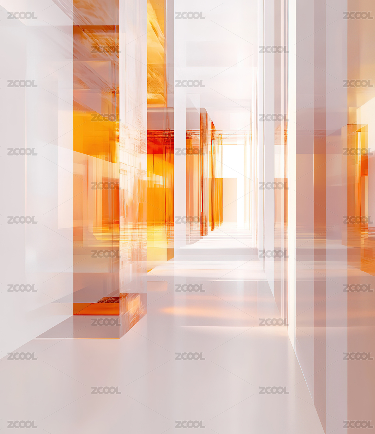 蓝色和橙色渐变的玻璃窗户,建筑物走廊