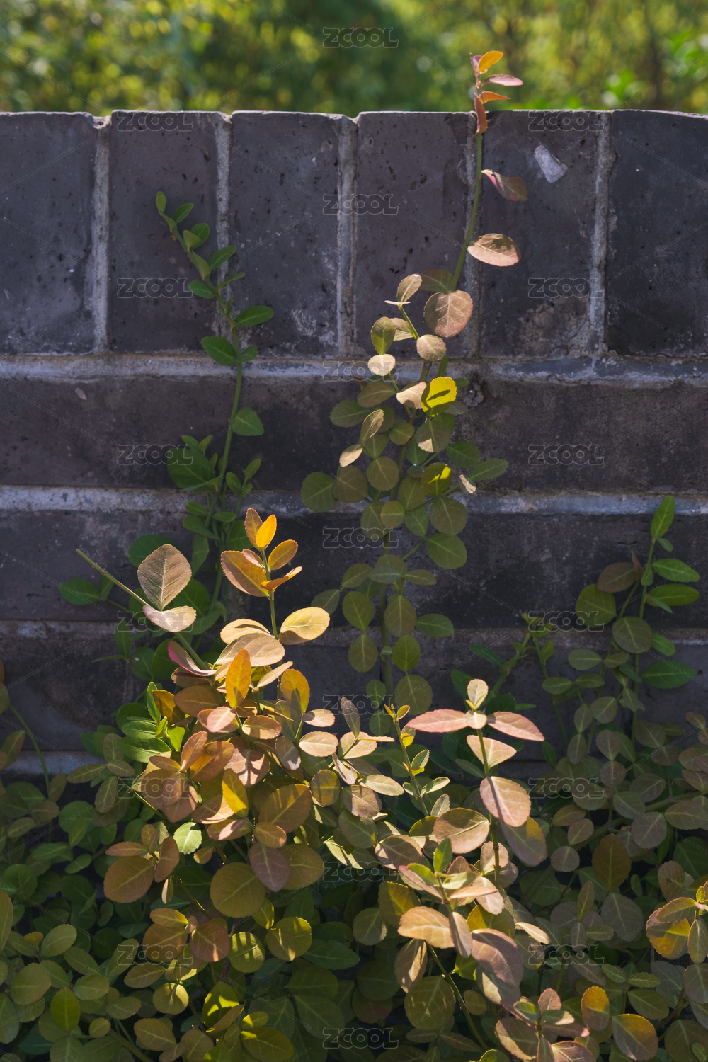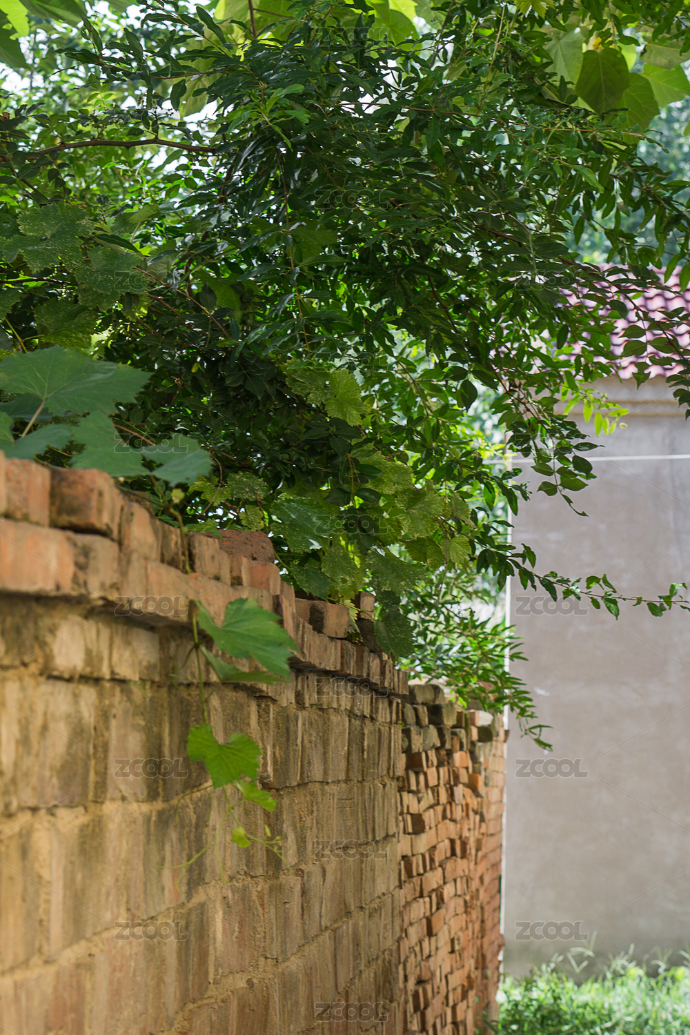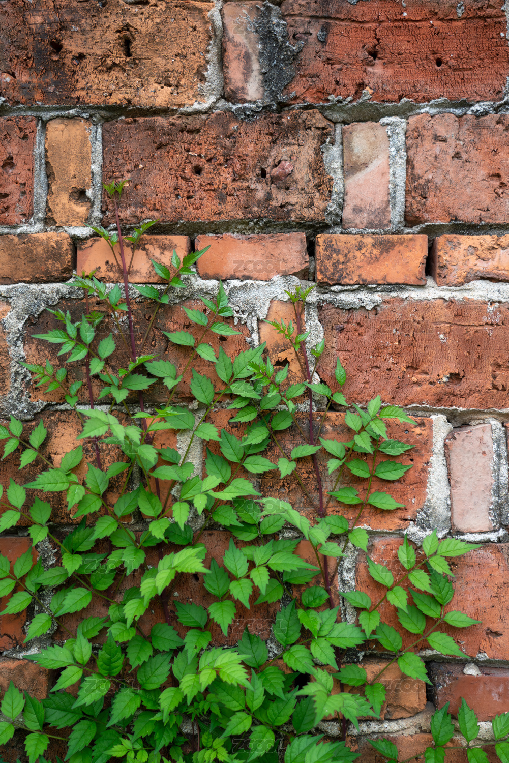 爬有凌霄花植物的红砖墙静物照