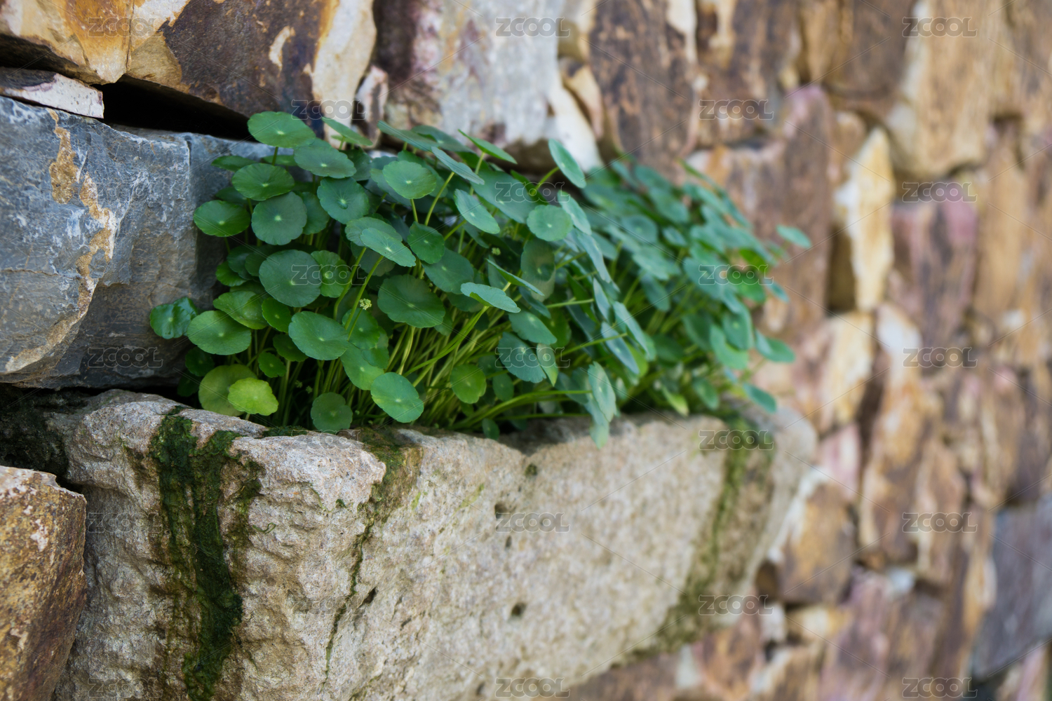 生长在石头墙上的绿色植物