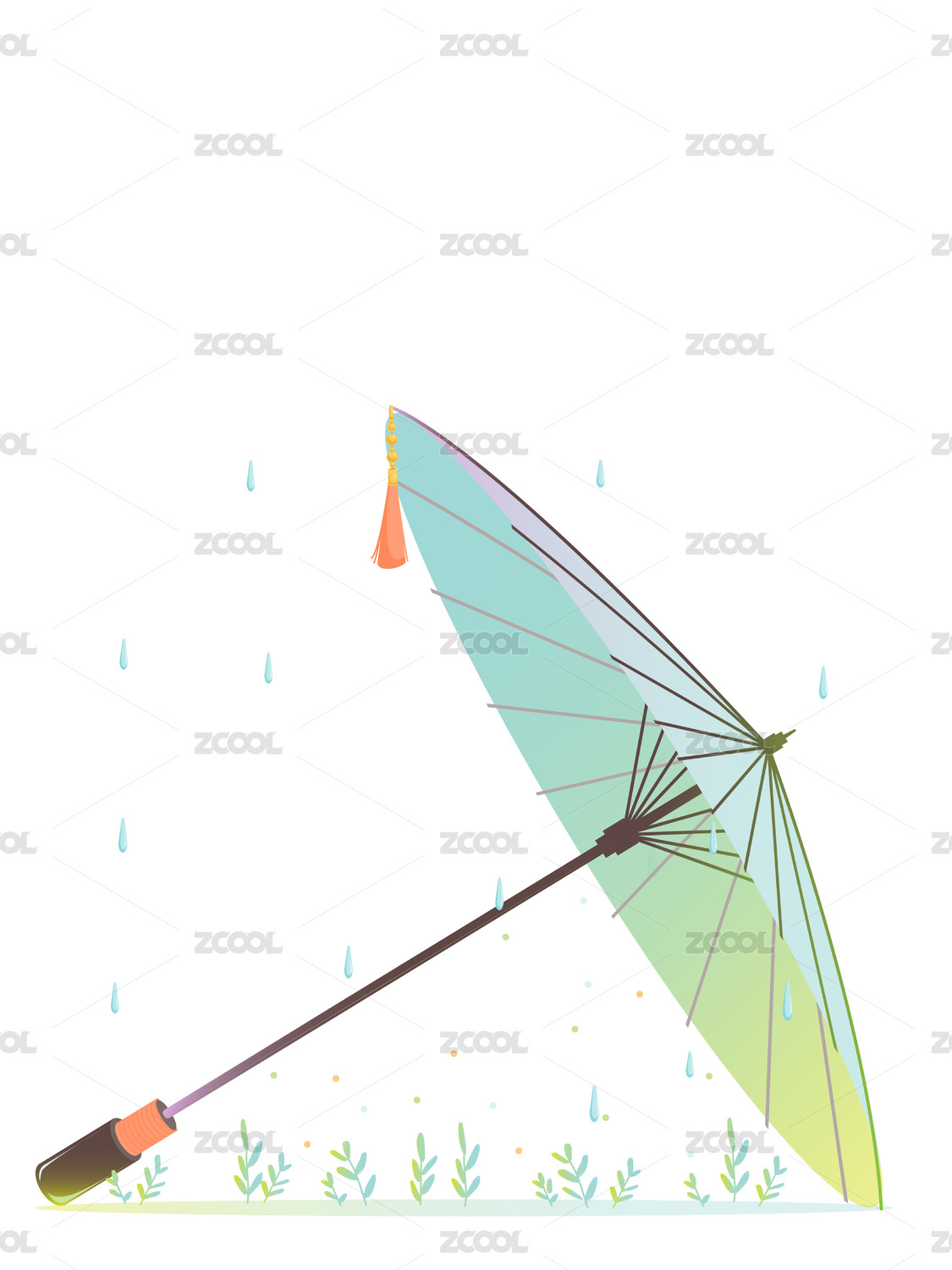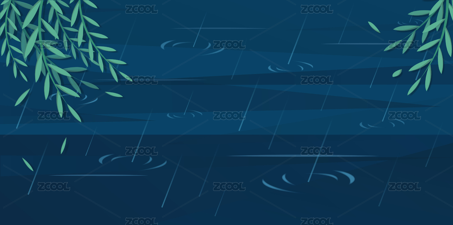 雨中长出绿叶的树枝,唯美清新自然雨景插画