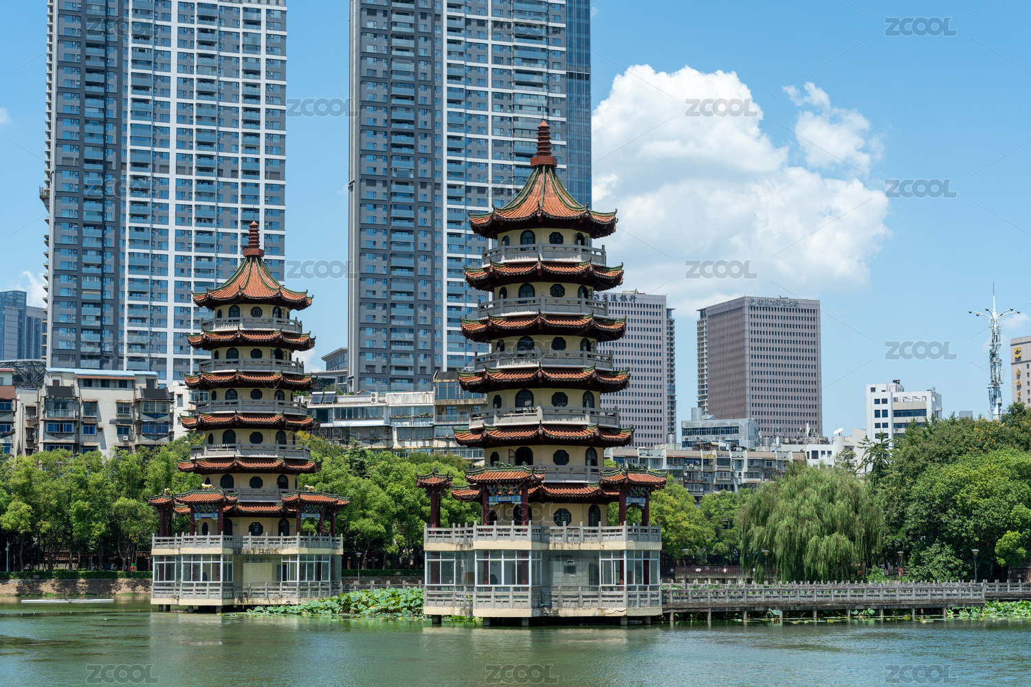 武汉宝岛公园城市中的古韵双塔