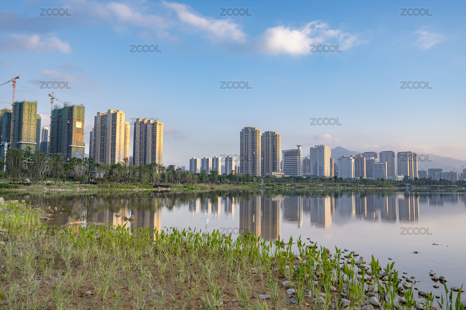 龙岩龙津湖东岸建筑群及倒影,中国福建龙岩