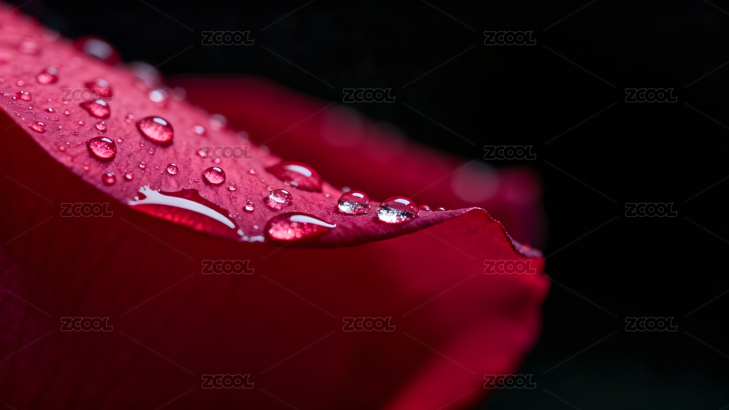 特写雨后火焰玫瑰红色花瓣局部水珠