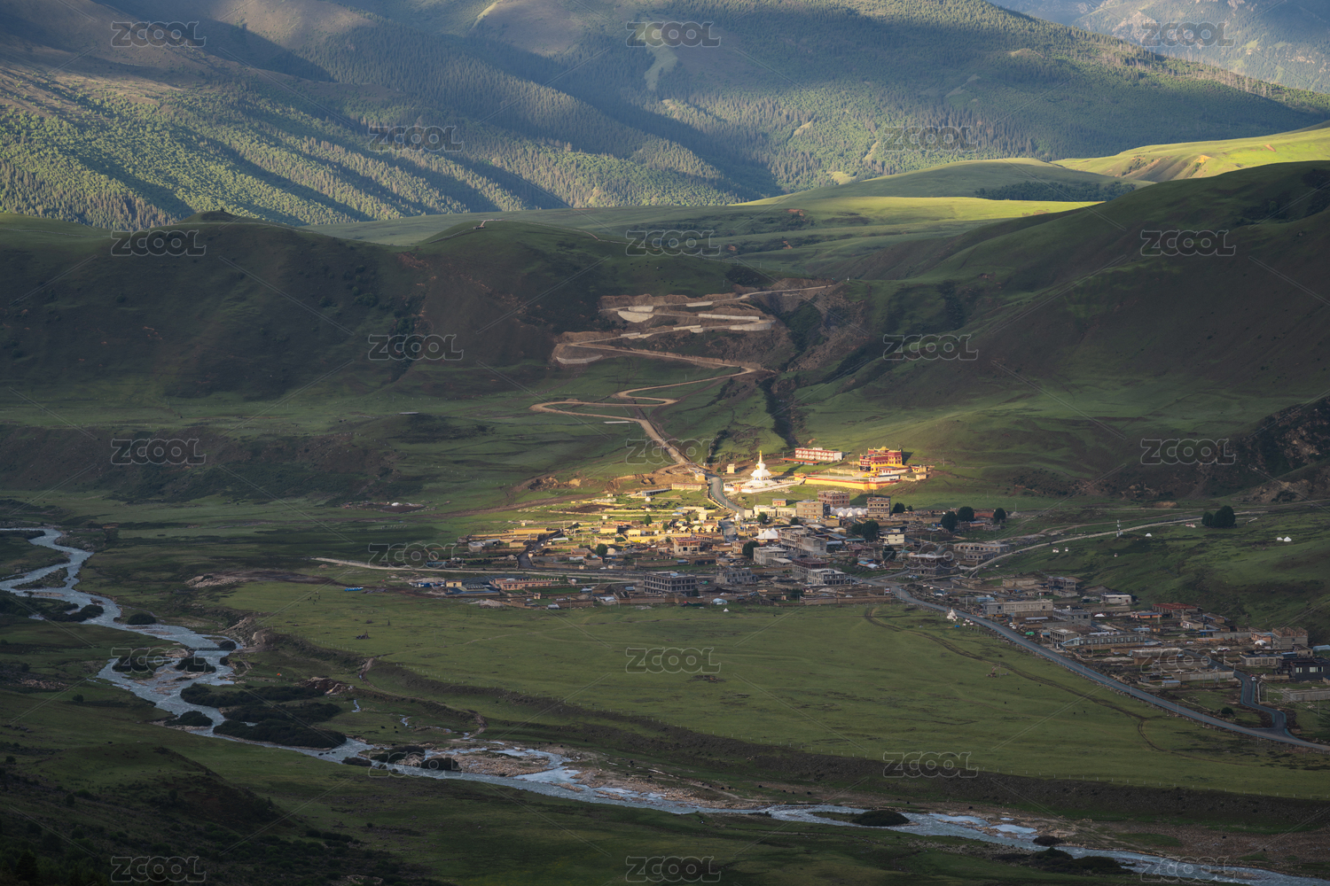 在阿坝黑水县德青郎寺观黑水县城峡谷全景