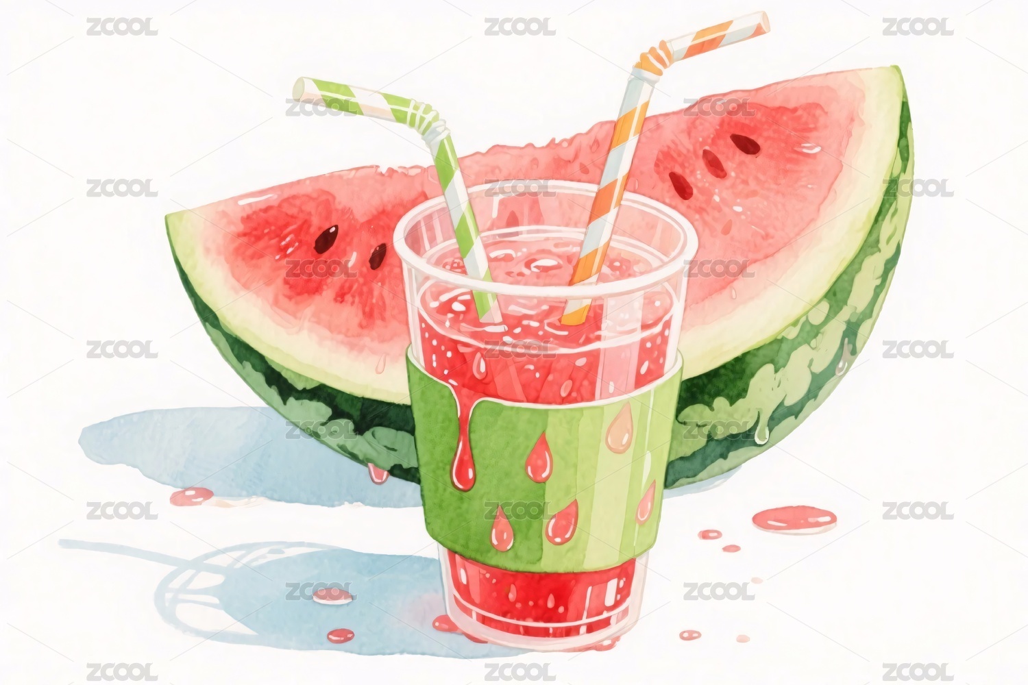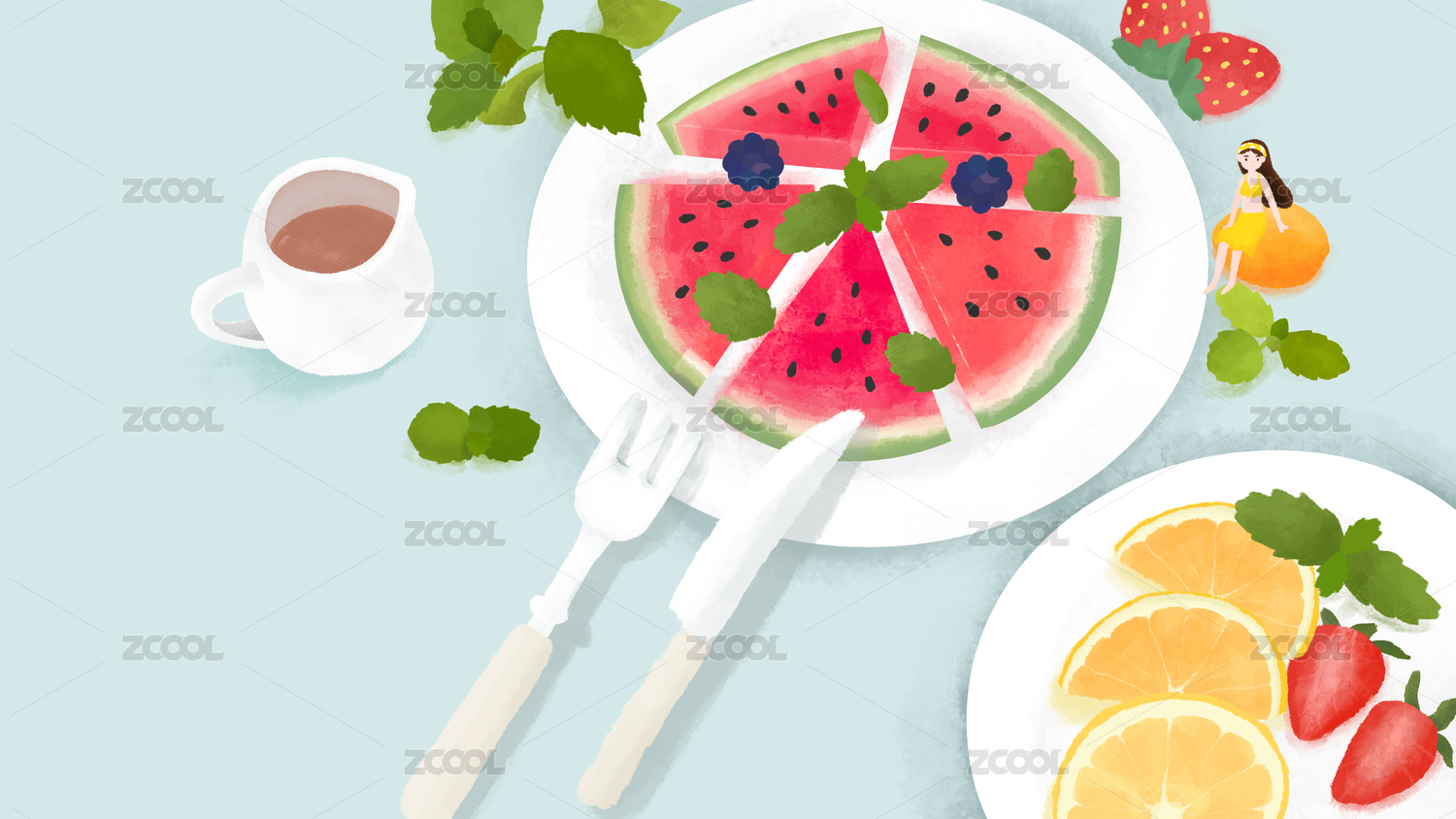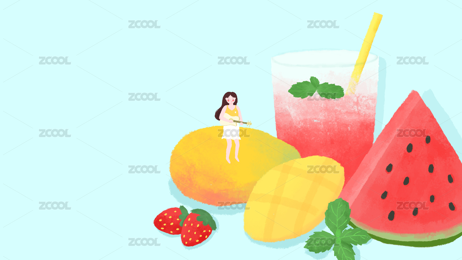 水果,插图,夏天,西瓜,草莓,芒果,饮料,食物,薄荷,女孩