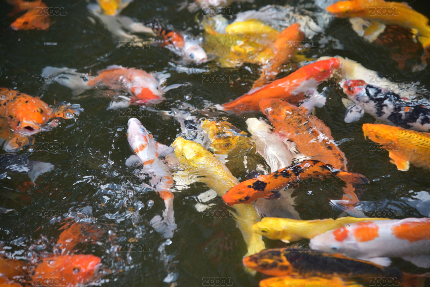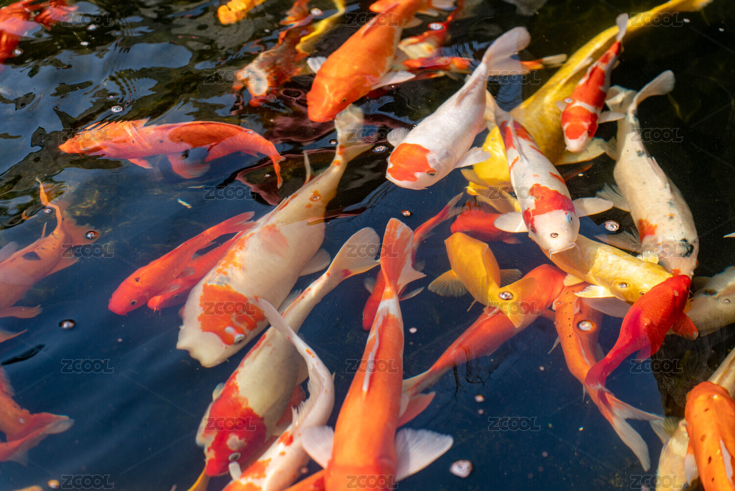 池塘中颜色艳丽追逐嬉戏的锦鲤