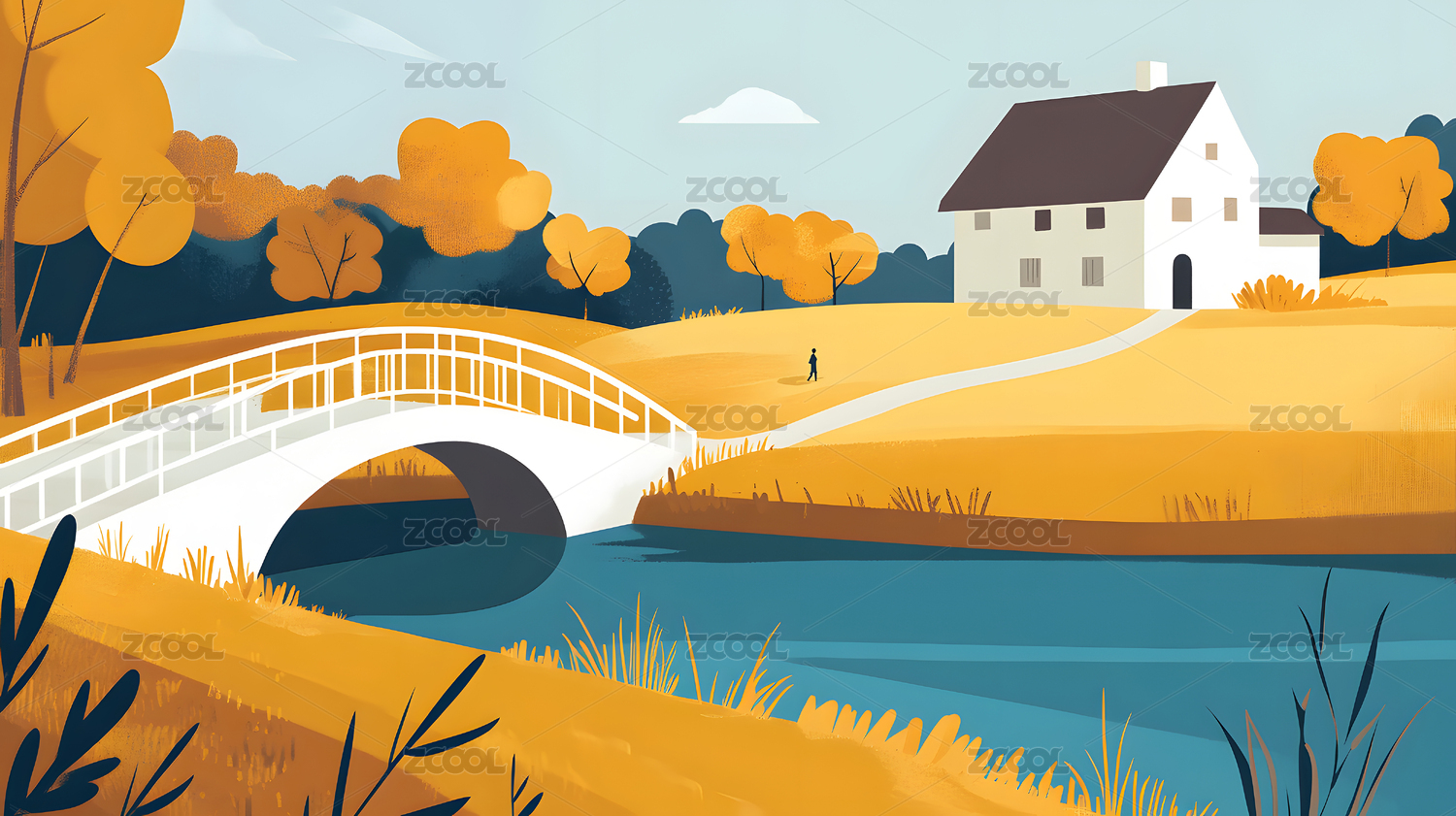 户外,插画,秋天,金秋,AIGC202402,公园,小桥,桥,水面,湖边