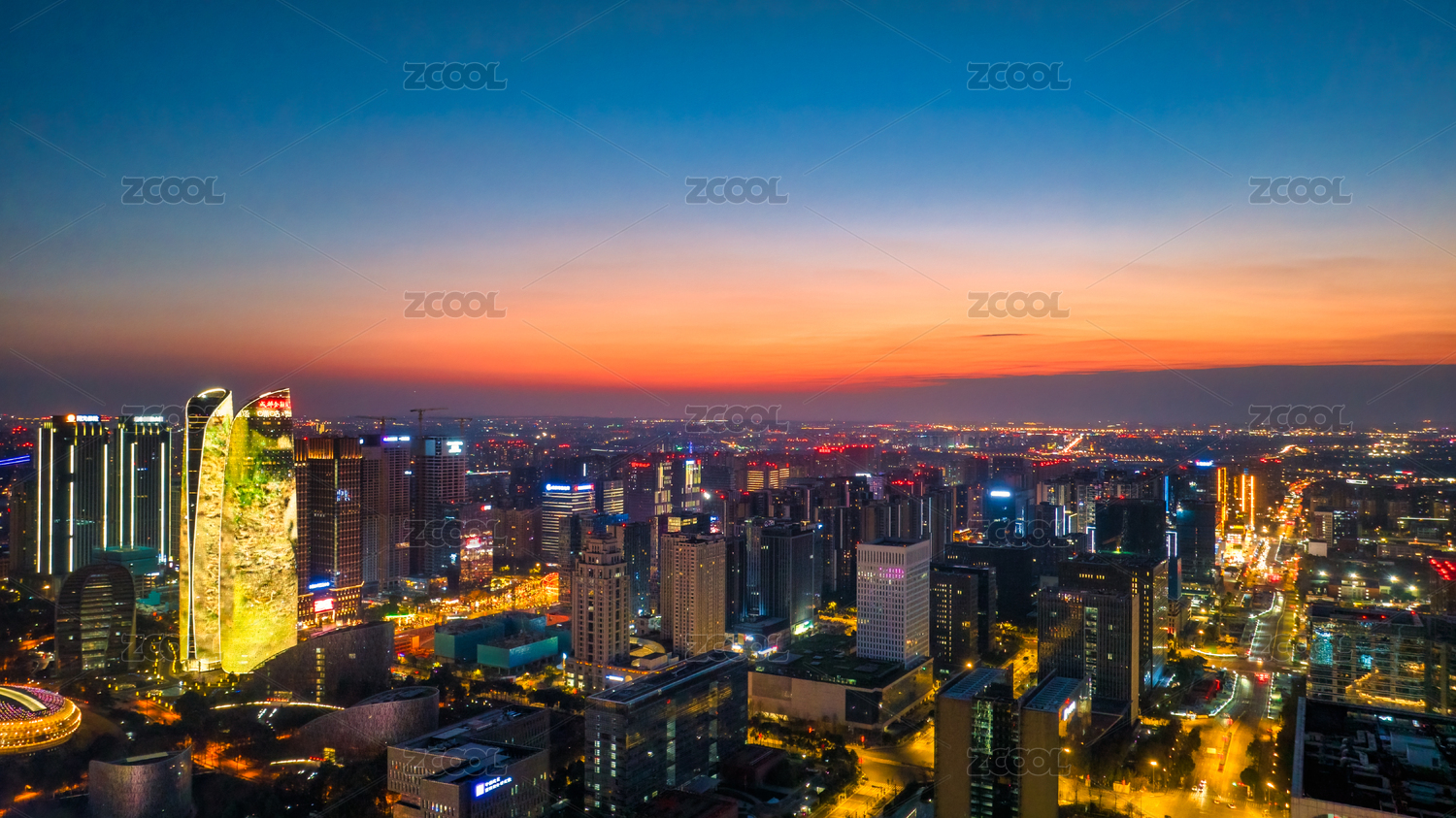 俯瞰晚霞时分的成都金融城双子塔及周边建筑